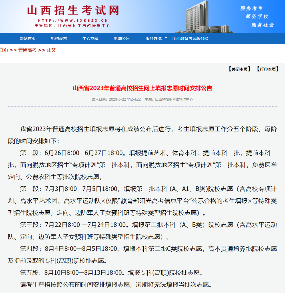 记者从山西省招生考试管理中心获悉,山西省2023年普通高校招生填报志愿工作分五个阶段,每阶段的时间安排如下: