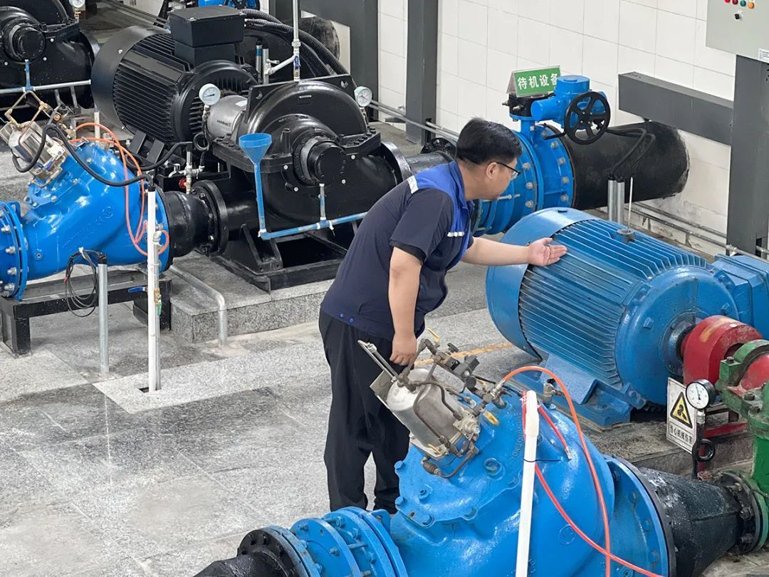在杨镇水厂内,工作人员正在对水厂设施设备进行逐一巡检,详细记录设备运行状态。杨镇网格服务中心主任董卫波介绍:“因为夏季高温天气影响设备散热,再加上供水量不断升高,水厂的设备巡检次数都是其他季节的三倍以上。”当前,杨镇网格服务中心所属各水厂内蓄水池已处于高水位蓄水状态,为保证恒压供水,厂内160千瓦的最大功率水泵机组已全面运转,保障周边24个自然村自来水供应。