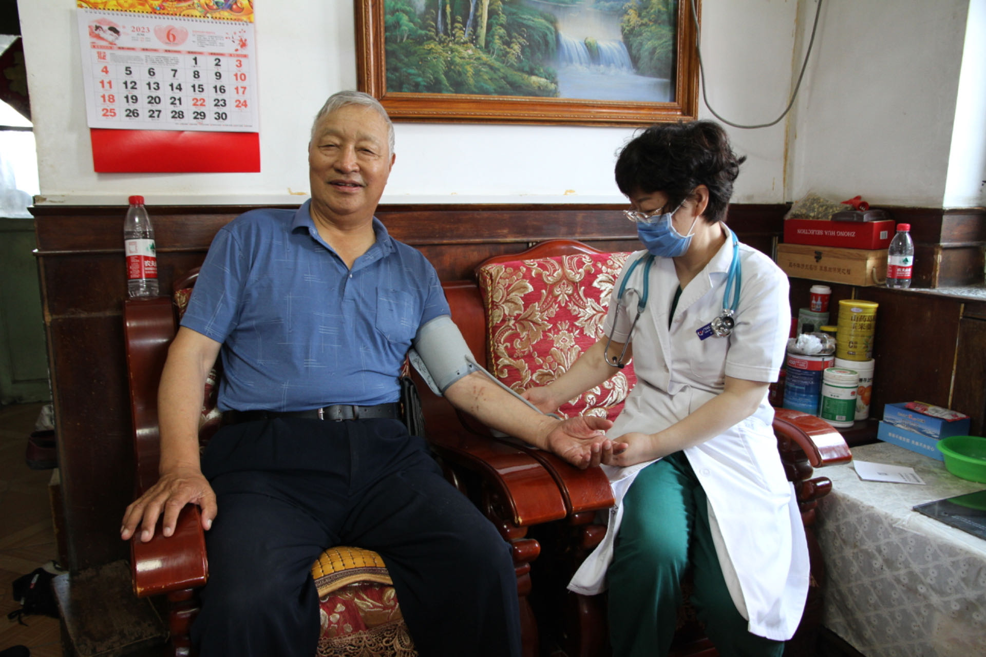 医生马新钊首先为王春普进行了血压检测,仔细询问了近期的健康状况及用药情况。随后,牛飞医生结合听诊和中医诊脉,用通俗易懂的语言向王春普讲解了他目前的身体健康情况,并从预防、治疗、饮食起居、运动等方面给予详细指导。