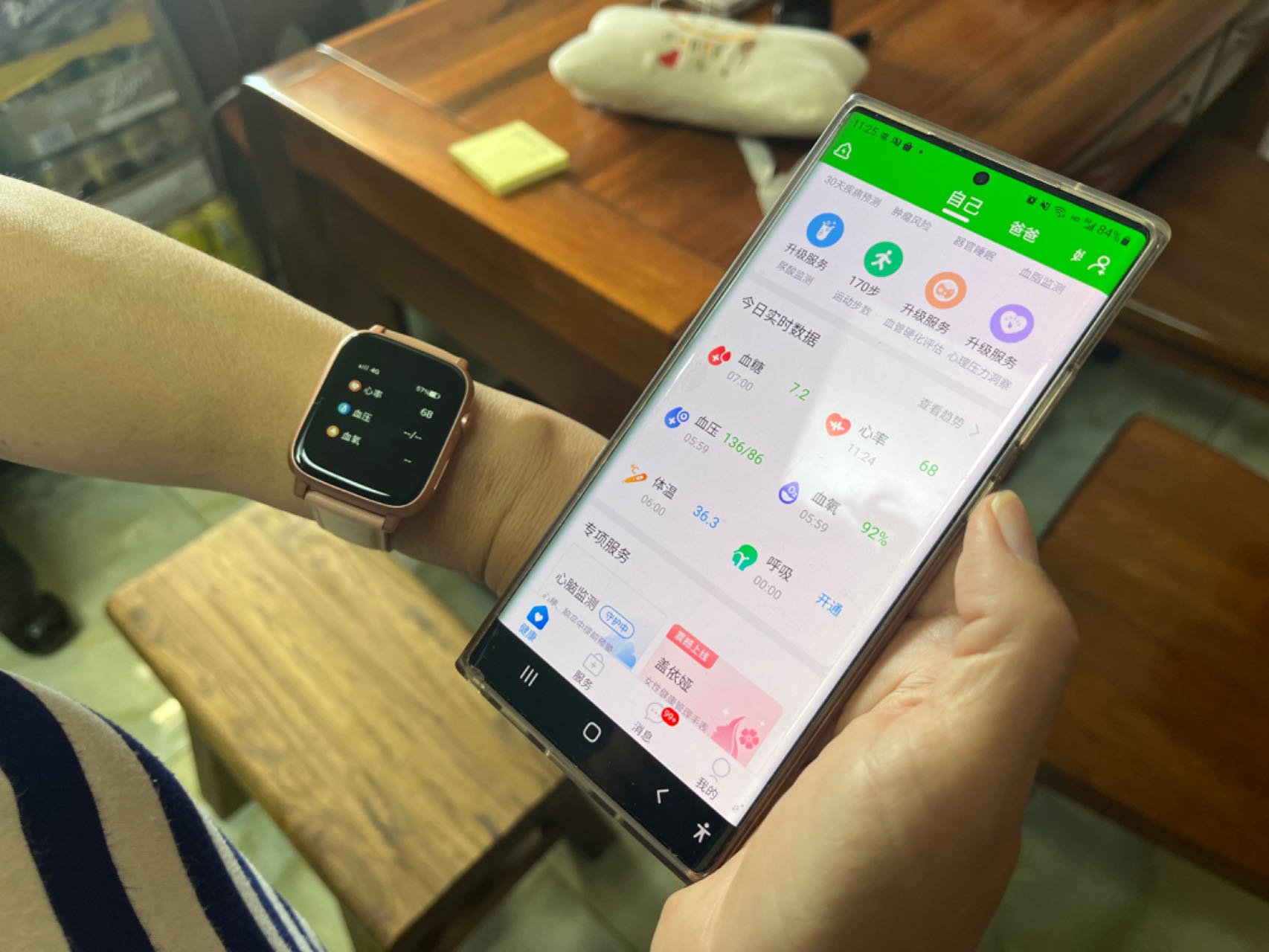 家住东山社区的张新萍是首批签约家庭医生的居民之一,在签约录入信息环节,社区卫生服务中心中医科医生牛飞对她的身体情况、既往病史和日常用药情况做了基本调查,并通过生命健康管理预警手环,对张新萍平日的健康状况进行实时监测。“血压挺稳定的,但最近是不是胃不舒服?得少吃点辣。”牛飞嘱咐张新萍。