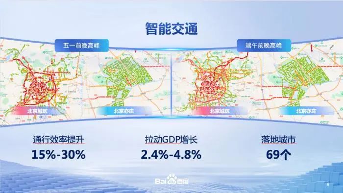 根据百度提供的数据,智能交通解决方案已经被69个城市采用。通过智能调整红绿灯的时间,可以让通行效率提升15%-30%,这将拉动GDP2.4%-4.8%的增长。