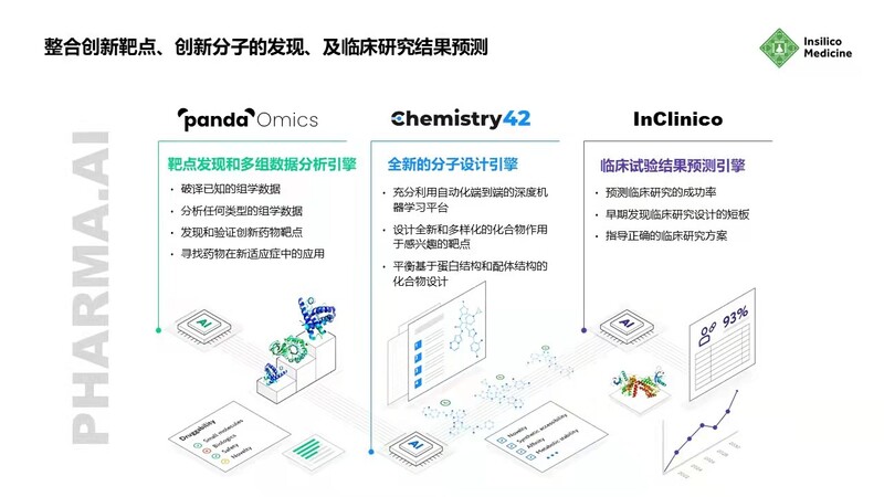 作为一家人工智能驱动的生物医药企业,英矽智能开发了一个“端到端”人工智能制药系统,包括靶点发现平台PandaOmics、小分子化合物设计和生成平台Chemistry42、临床试验结果预测平台InClinico。