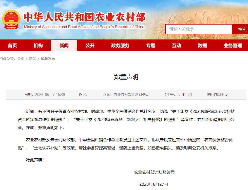 农业农村部网站消息,近期,有不法分子假冒农业农村部、财政部、中华全国供销合作总社名义,伪造“关于印发《2023家庭农场专项补贴资金的实施办法》的通知”、“关于下发《2023家庭农场‘新农人’相关补贴》的通知”等文件,并加盖伪造的部门公章。在此,郑重声明如下: