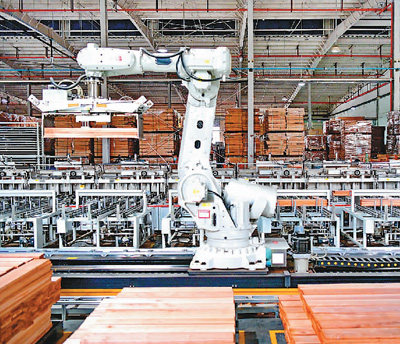 江西省赣州市南康区出台数字化转型奖励扶持政策,在技术攻坚、资金奖补、创新研发方面,激励引导家具生产企业利用数字化工具、工业互联网、产业大数据平台提升生产效率,降低生产综合成本,不断激发企业数字化转型发展潜能。图为在南康区的一家品牌木地板上市企业智能车间,码垛机械臂快速运转。朱海鹏摄(人民图片)