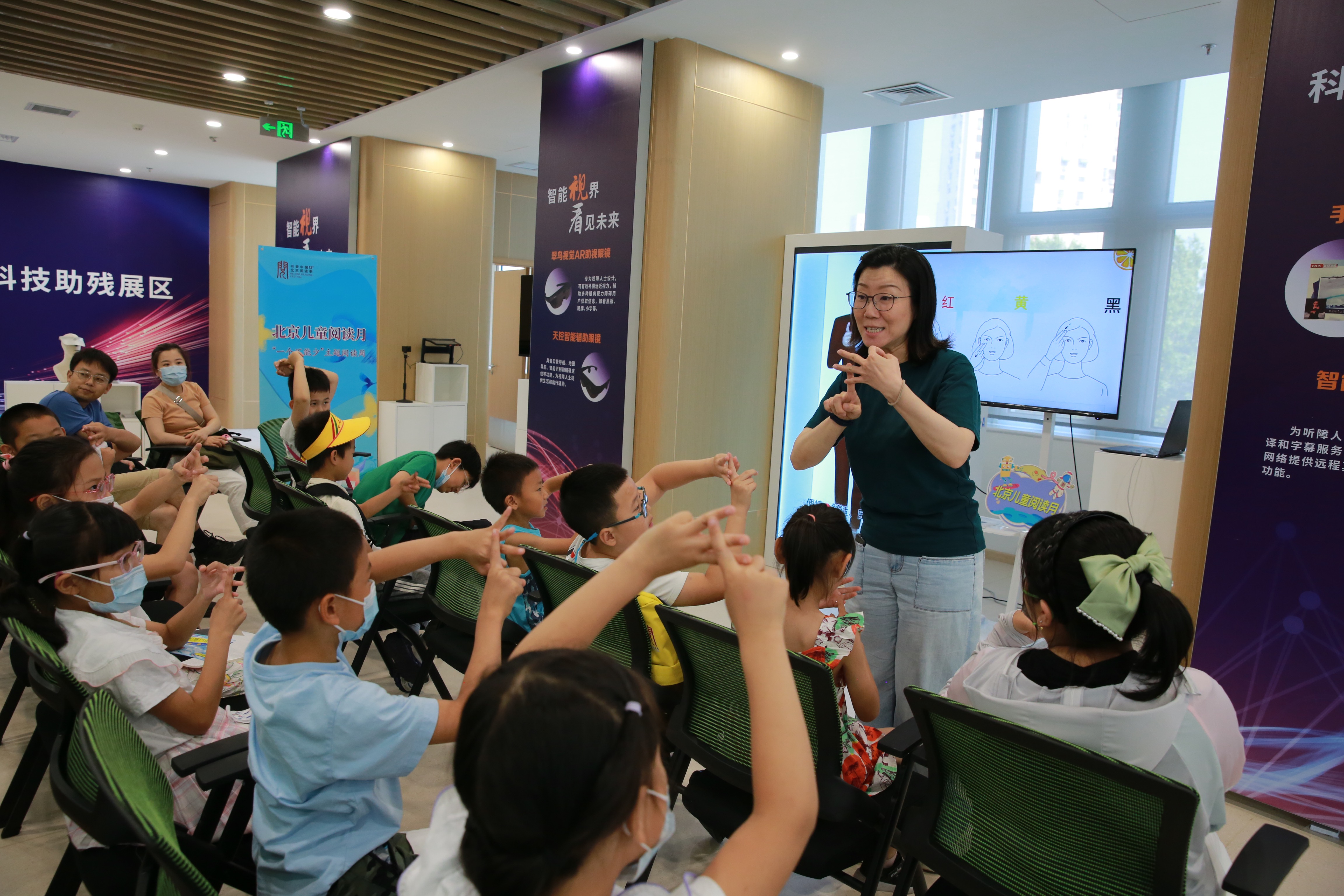 随后,在示范中心老师的带领下,孩子们参观了“汇爱回廊”感受“全国十大精品”无障碍设施案例,体验无障碍影片观影。并在活动中了解基本手语知识及互动组,体验信息无障碍高科技设备。