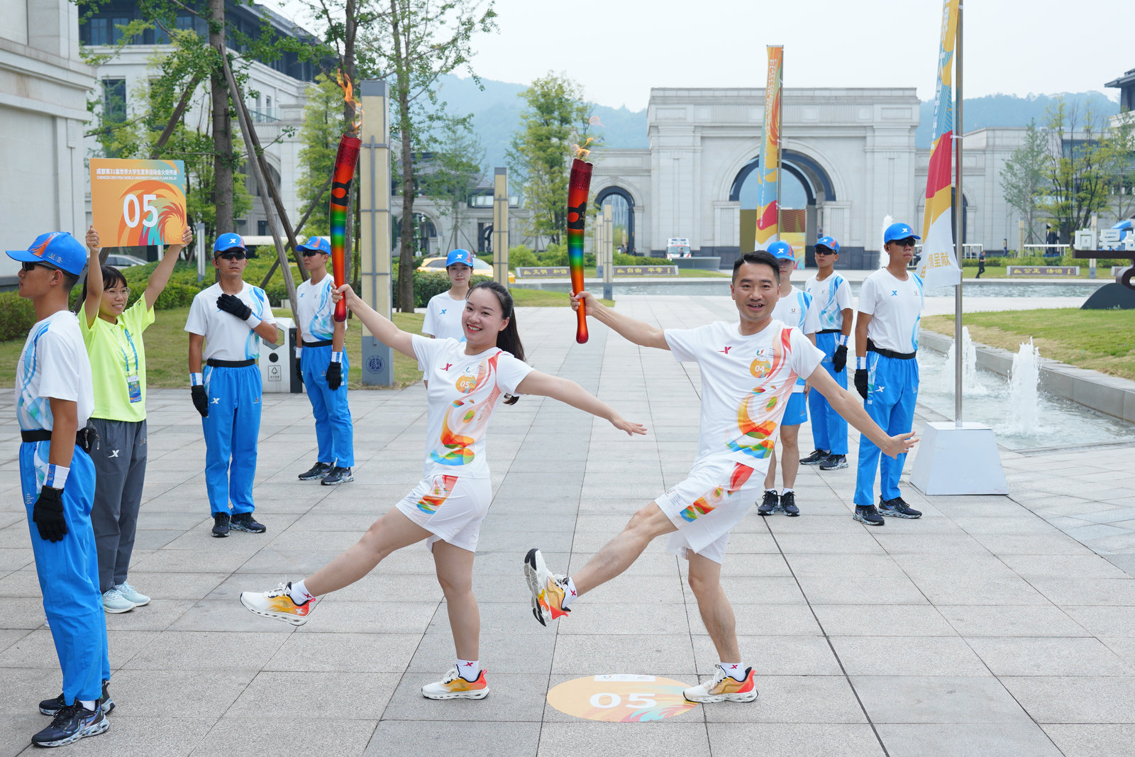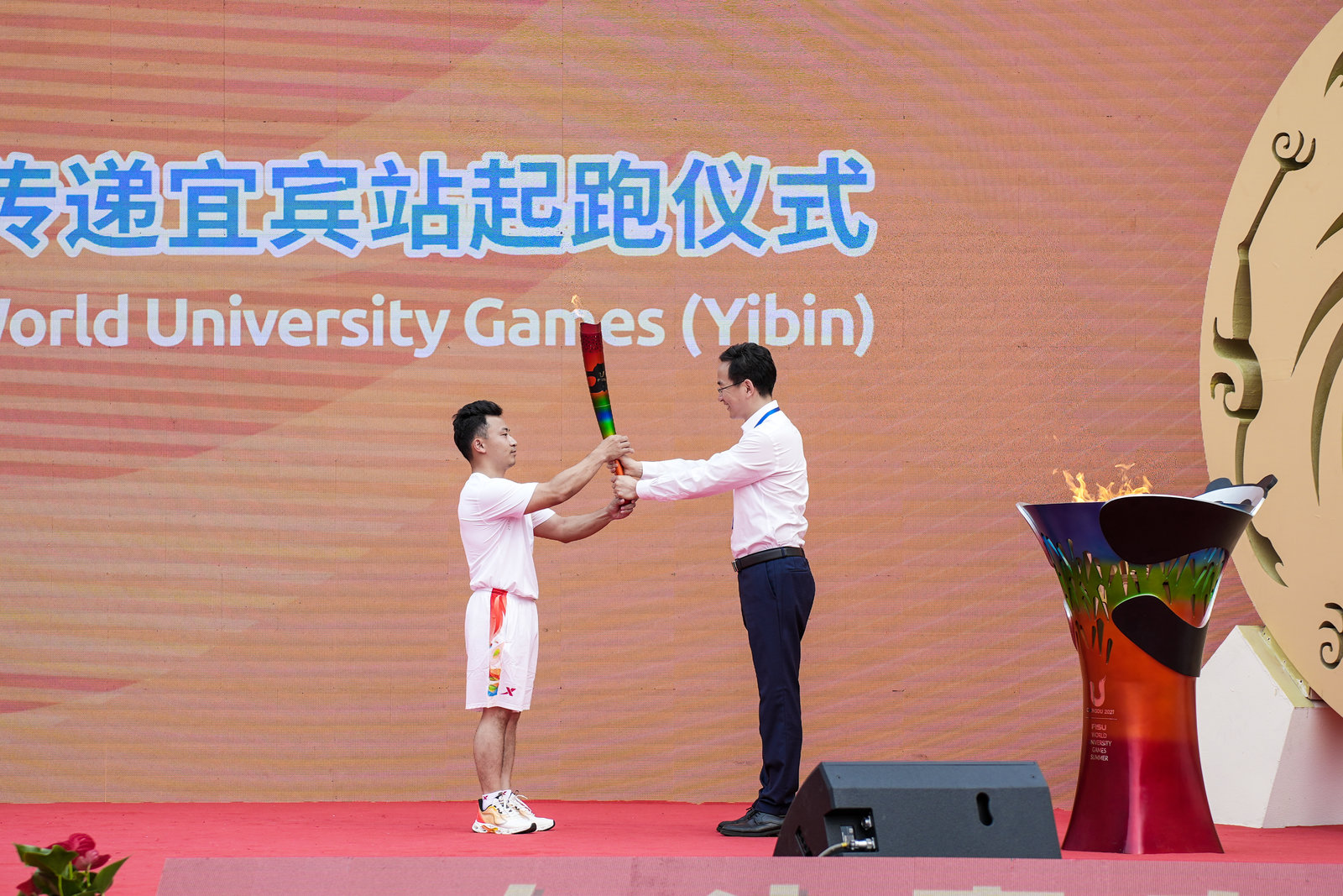 亚洲大学生体育联合会主席、教育部学生体育协会联合秘书处秘书长、中国大学生体育协会副主席刘立新点燃成都大运会火种盆后,宜宾市委书记方存好点燃大运会火炬“蓉火”,并交给宜宾站火炬传递第一棒火炬手、体操奥运冠军冯喆。在成都大运会火炬传递主题曲《我们都是追梦人》的旋律中,冯喆高擎火炬,开始了宜宾站火炬传递。