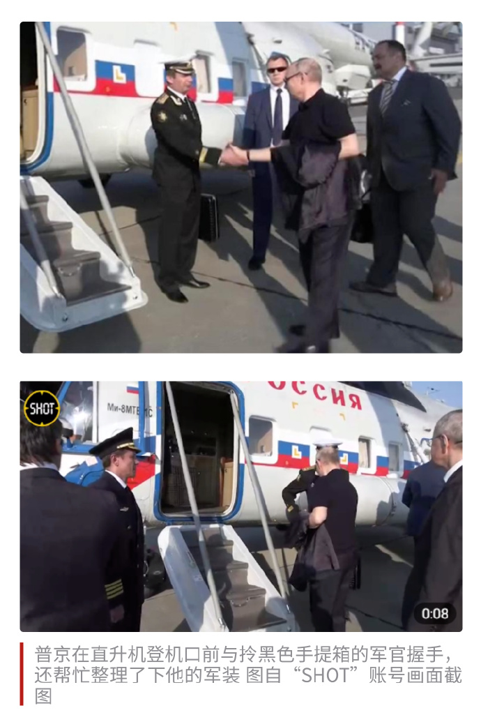 《报纸报》称,根据社交平台Telegram上发布俄罗斯新闻的账号“SHOT”曝出的现场画面,普京当时走到直升机登机口,与一名军官握手,然后帮忙整理了下他的军装。随后又走到另一名军官面前与他握手,之后便登上直升机。