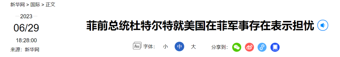 菲律宾前总统罗德里戈·杜特尔特日前表示,他对美国在菲的军事存在表示担忧,认为美在菲的军事存在会置菲于“险境”。