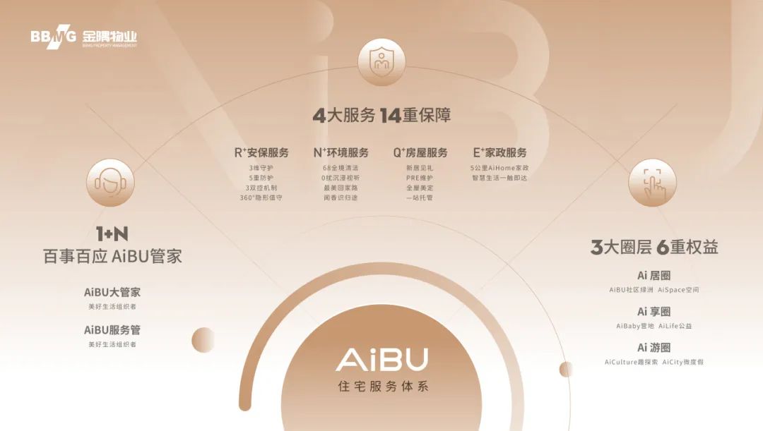 让美好不断新生,是金隅物业推出AiBU住宅服务体系的初衷所在。AiBU住宅服务体系,灵感来源于achieve beauty。其设计理念来源于物业是家的守护者,全面深入的住宅物业服务为家庭生活带来安心保障,从而为业主提供了大胆探索美好人生的底气。金隅物业珍视业主愿景,秉承“由家出发,开启美好”的设计理念,积极发挥“链接者”角色价值,以人为本,关注体验,围绕“家”,从“家”的服务基本盘出发,聚焦1+N百事百应AiBU管家、4大服务板块14重服务保障、3大人居圈层6重权益展开服务架构,设计出全新的AiBU住宅服务体系。希望通过探索住宅服务的多元可能,助力业主拓宽人生的美好可能。