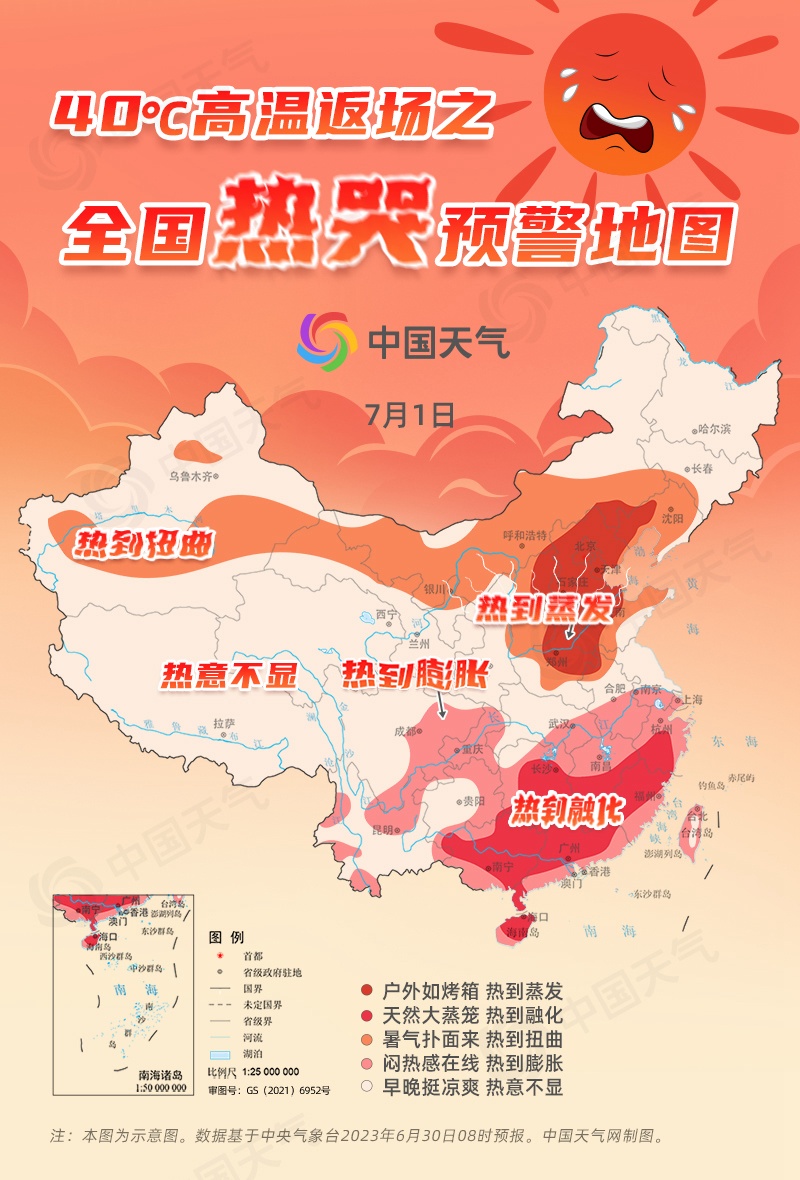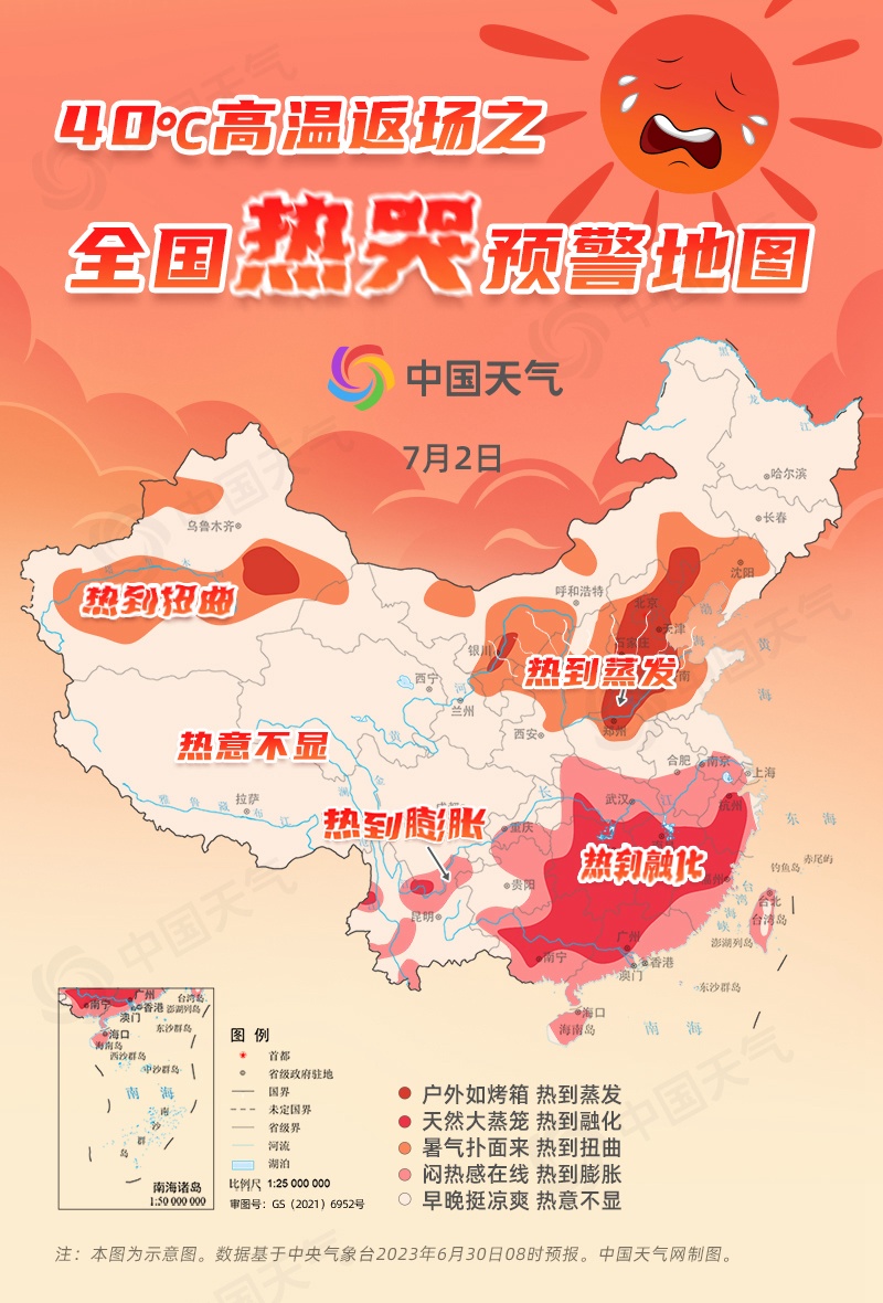 近期,我国北方多地高温“超长待机”,未来十天有两轮高温过程,京津冀等地40℃高温再返场,同时江南、华南一带也会加入高温群聊。今起三天(6月30日至7月2日),全国超20省份的小伙伴可能被“热哭”,不少网友吐槽“出门到处都是熟人”。中国天气网特别推出今年首个全国热哭预警地图,看看你家是“热到蒸发”还是“热到融化”,还有防暑指南助你巧妙应对高温持久战。