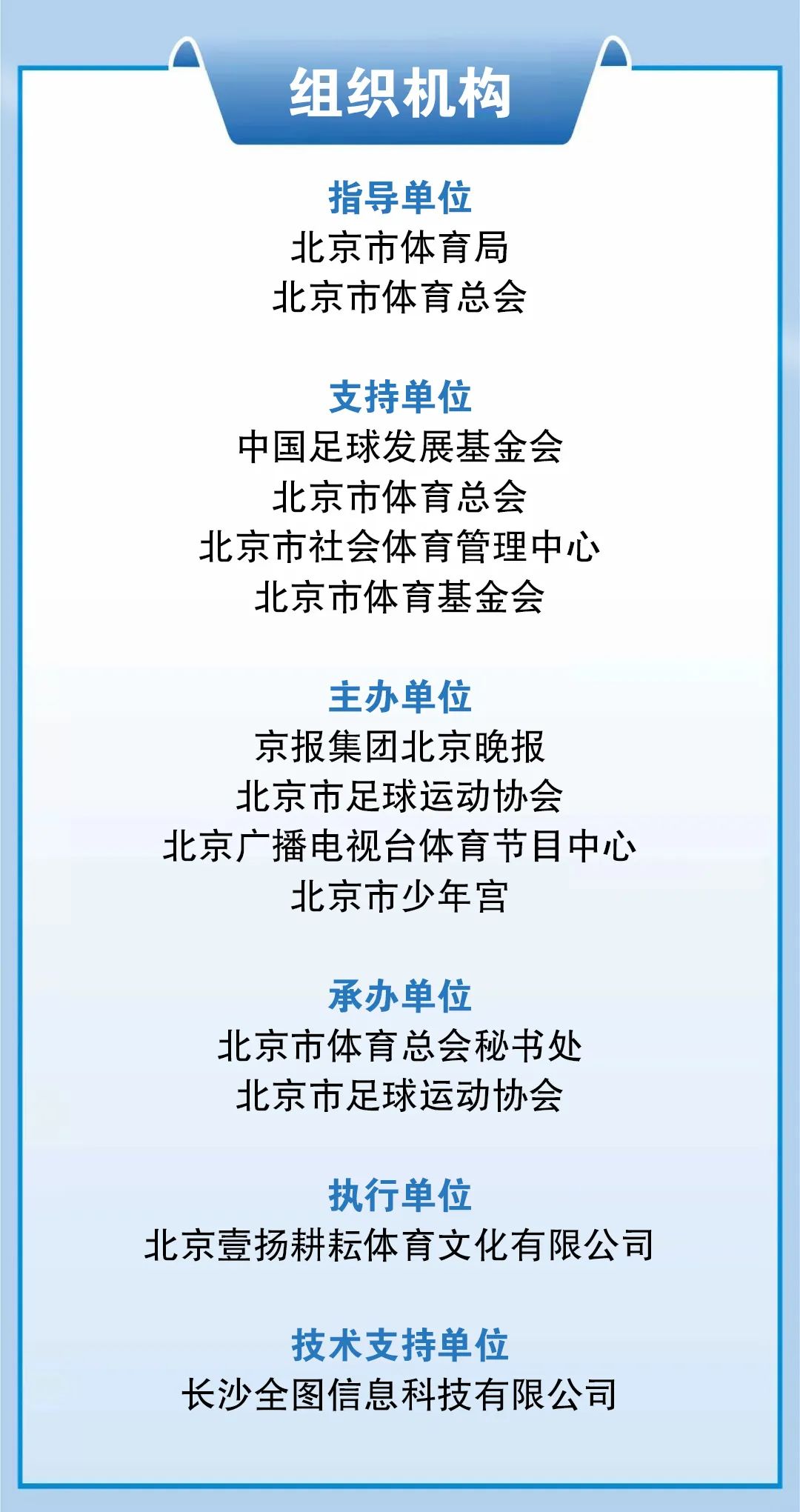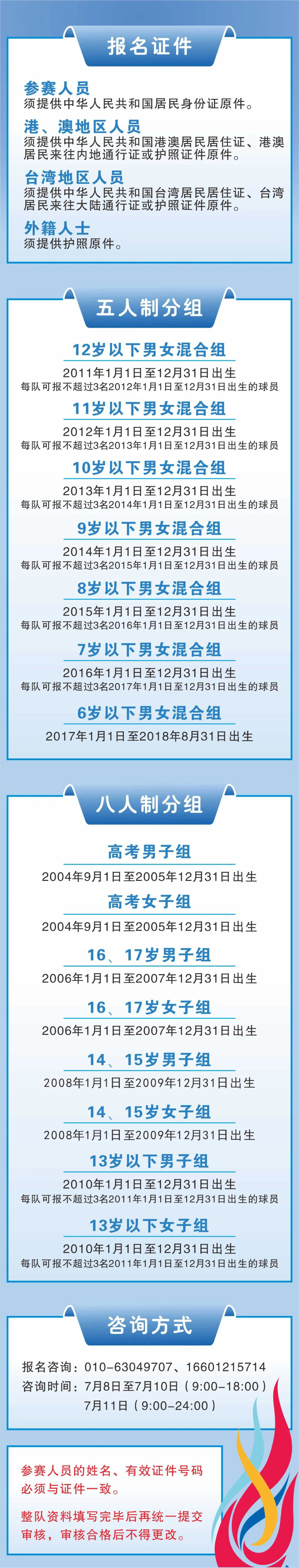 北京市所有适龄青少年均可自由组队参赛,但每人只能代表一支队伍参加一个组别的比赛,不得冒名顶替弄虚作假,一经发现核实后取消该队比赛资格及全部比赛成绩。此外,五人制比赛每队报名队员为6至10人,八人制比赛每队报名队员为9至16人,每队可报领队、教练员、翻译、队医、队务等管理人员3至5名。