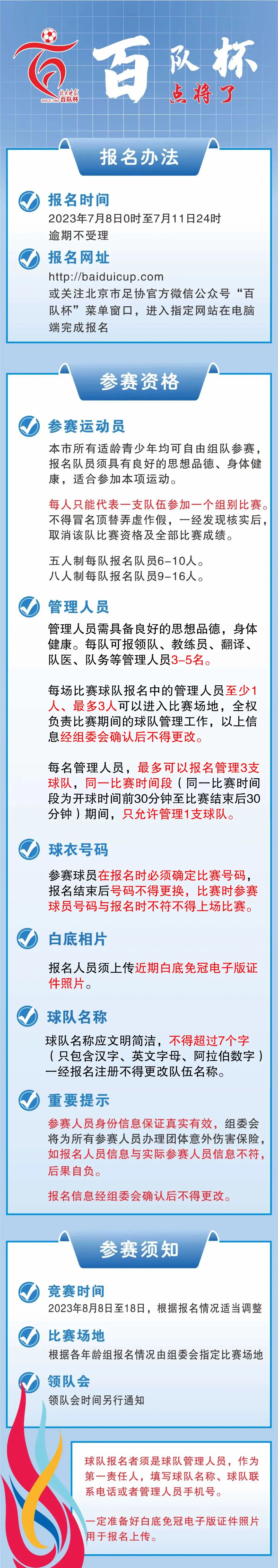 距离报名开启还有近一周的时间,百队杯组委会再次提醒大家两个重要事项,报名须身份证原件、须白底证件照,请参赛队伍提前备好。另外,7月12日至13日,是百队杯组委会审核报名时间,请报名人员关注手机动态,如未审核通过,尽快修改报名信息,24小时内再次提交审核。