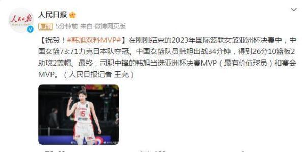 在刚刚结束的2023年国际篮联女篮亚洲杯决赛中,中国女篮73:71力克日本队夺冠。中国女篮队员韩旭出战34分钟,得到26分10篮板2助攻2盖帽。最终,司职中锋的韩旭当选亚洲杯决赛MVP(最有价值球员)和赛会MVP。