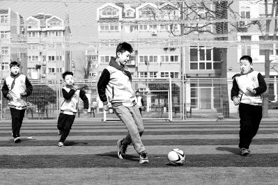 2月16日,在山东省青岛市四流中路三小,小学生进行足球训练。张鹰摄/光明图片