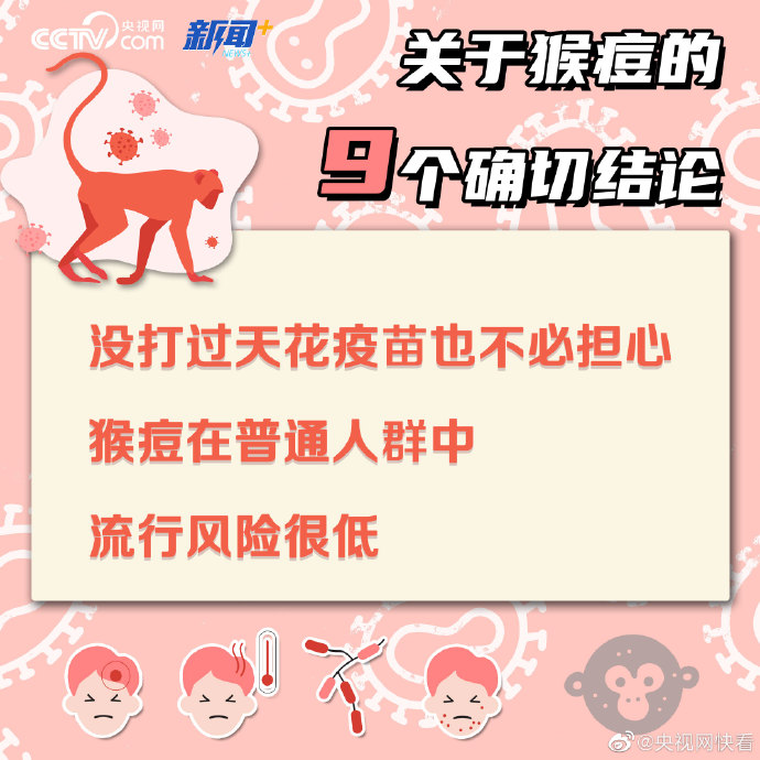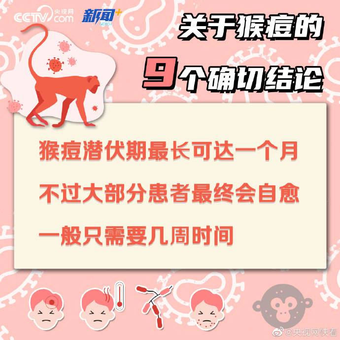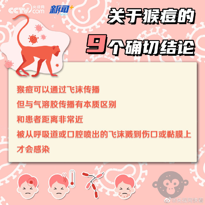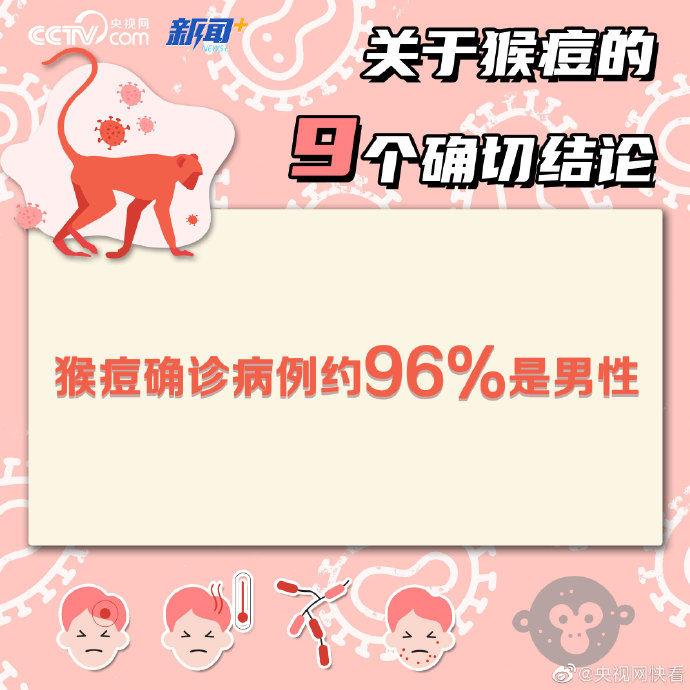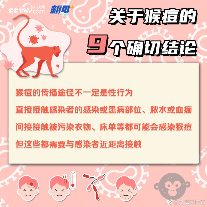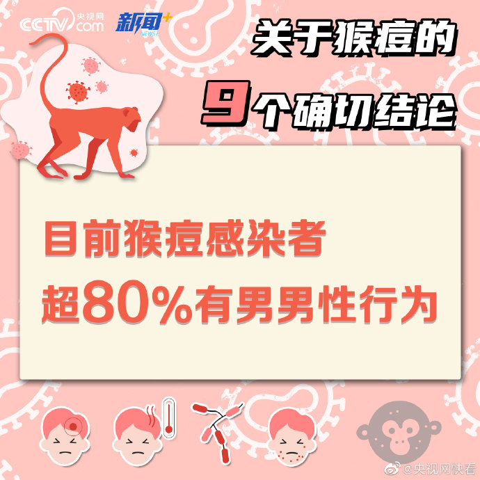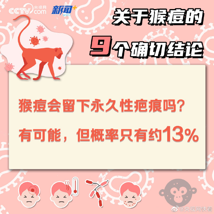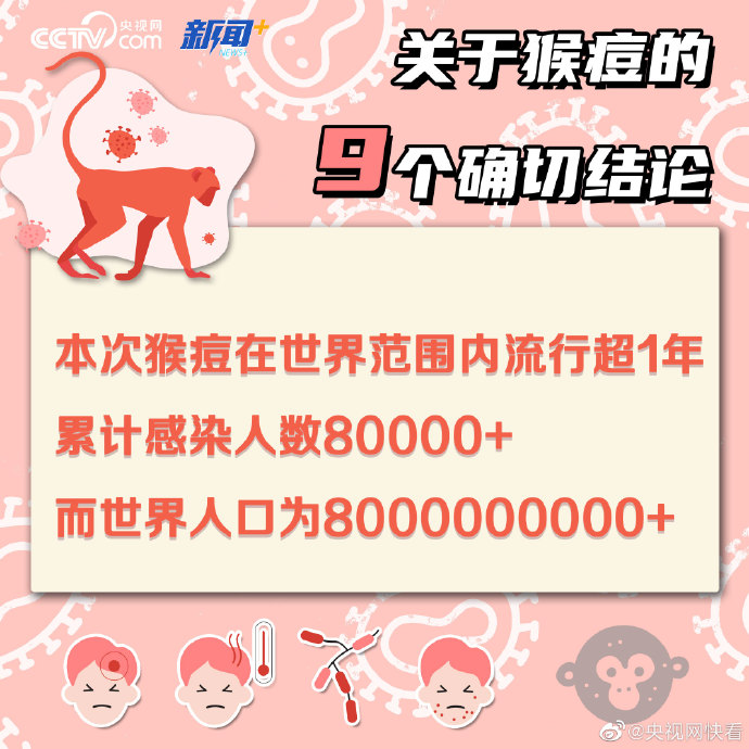 ①本次猴痘在世界范围内流行超一年,累计感染人数为8万多人②猴痘确诊病例约96%是男性③目前猴痘感染者超80%有男男性行为④猴痘的传播途径不一定是性行为,直接接触感染者的感染或患病部位、脓水或血痂,间接接触被污染的衣物、床单等都可能会感染猴痘,但这些都需要与感染者近距离接触⑤猴痘可以通过飞沫传播,但与气溶胶传播有本质区别,和患者距离非常近才会感染⑥猴痘也有无症状感染者⑦没打过天花疫苗也不必担心,猴痘在普通人群中流行的风险很低⑧猴痘会留下永久性疤痕吗?有可能,但概率只有约13%⑨猴痘潜伏期最长可达一个月,不过大部分患者最终会自愈,一般也只需几周时间。