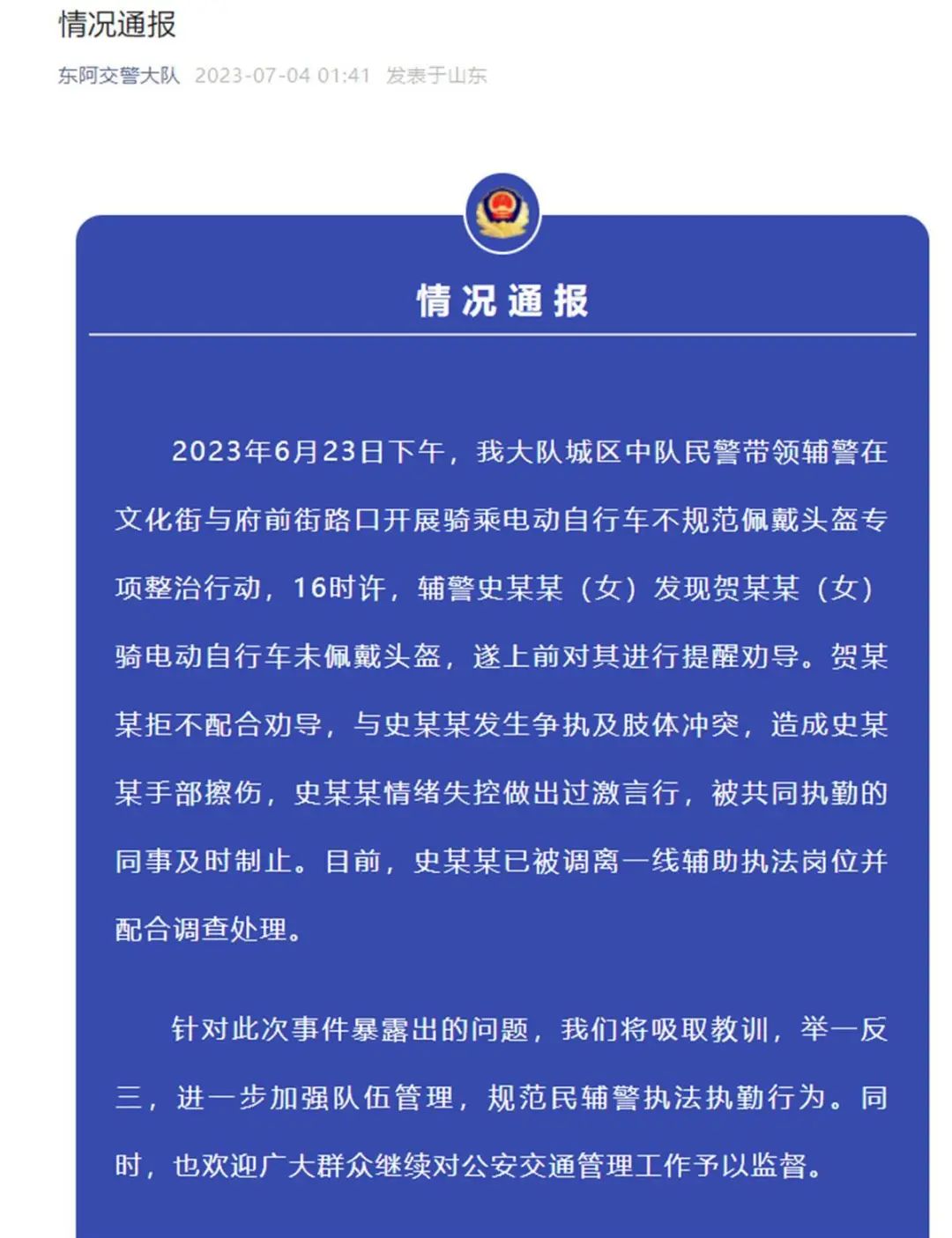 2023年6月23日下午,该大队城区中队民警带领辅警在文化街与府前街路口开展骑乘电动自行车不规范佩戴头盔专项整治行动,16时许,辅警史某某(女)发现贺某某(女)骑电动自行车未佩戴头盔,遂上前对其进行提醒劝导。贺某某拒不配合劝导,与史某某发生争执及肢体冲突,造成史某某手部擦伤,史某某情绪失控做出过激言行,被共同执勤的同事及时制止。目前,史某某已被调离一线辅助执法岗位并配合调查处理。