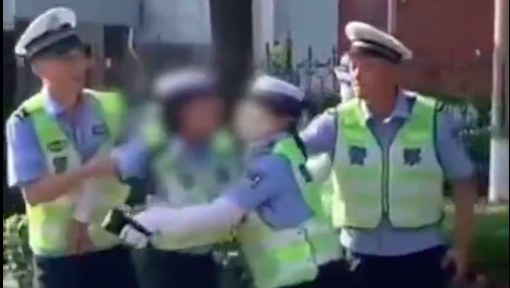 7月2日,山东聊城,网传东阿县一名女“交警”辱骂市民,扬言“弄死你”,还准备踢踹骑电动车的女子,随后被同事架走。