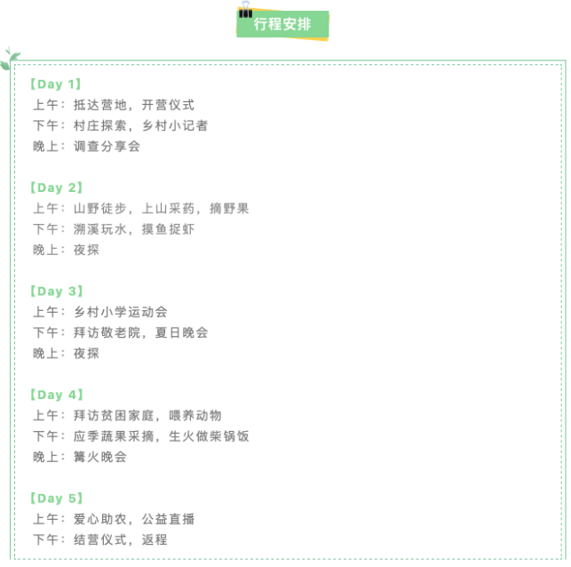 裴女士随便点开家长群中一个名为“乡野童趣公益研学项目”的链接,广告中介绍:孩子们将去往河北省的一个村庄,在享受自然野趣的同时走访不同的家庭,参与农事活动,学习独立生活技能。然而,仔细研究行程安排就能发现,5天中只有一天半的活动与该主题相关,剩下的均以山野徒步、溯溪玩水、摸鱼捉虾、蔬果采摘等活动“充数”。