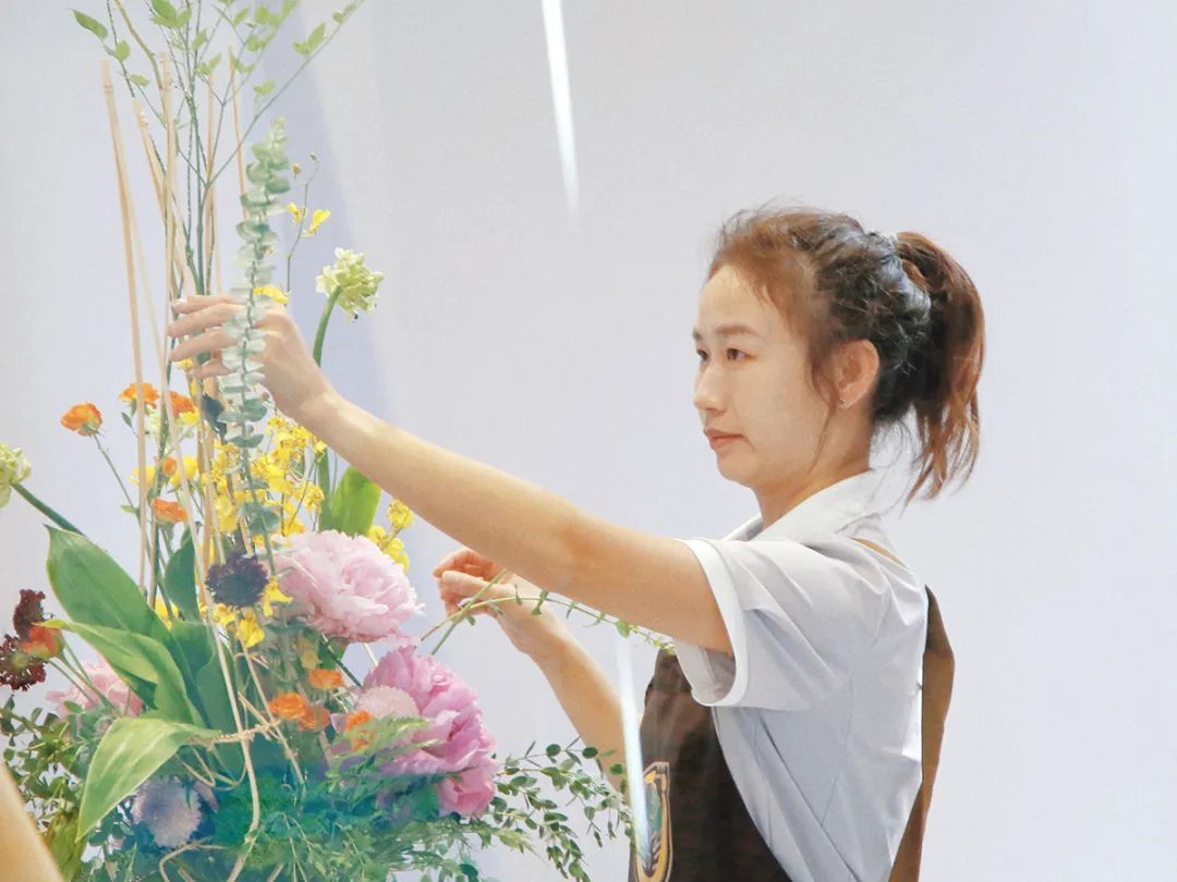 另一位来自顺义的选手梁俊通过微信告诉记者:“这是我第一次代表北京队参加全国残疾人职业技能比赛,心情很激动,通过这样的比赛,我不仅交到了很多朋友,还提升了职业技能水平。”记者了解到,梁俊患有先天性聋哑疾病,但性格开朗、勤奋努力,毕业后做过美术设计师、平面设计师。她学习插花时间虽然不长,却深刻感受到了插花带来的改变。记者看到梁俊的参赛作品,虽然只有几种淡雅的颜色,但是不同色调的粉色叠加,再加上绿色的烘托,让整个花艺作品更加清新悦目。“这件作品想表达的是欣欣向荣的寓意,希望大家的生活都是向上、充满正能量的。”她告诉记者。