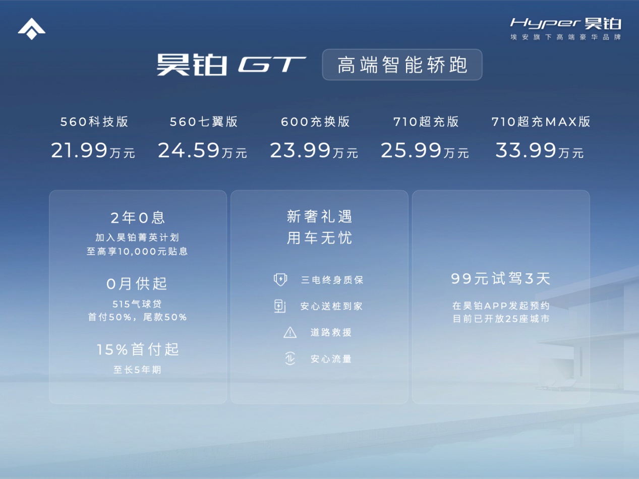 昊铂GT新车共推出包括560km、600km、710km三种续航里程在内的5个版本,补贴后的售价区间为21.99万-33.99万元。首任购车的用户可享受三电终身质保、安心送桩到家、免费道路救援、终身不限量安心流量等权益。2023年7月31日前下订的首任车主,还可享受限时整车终身质保。