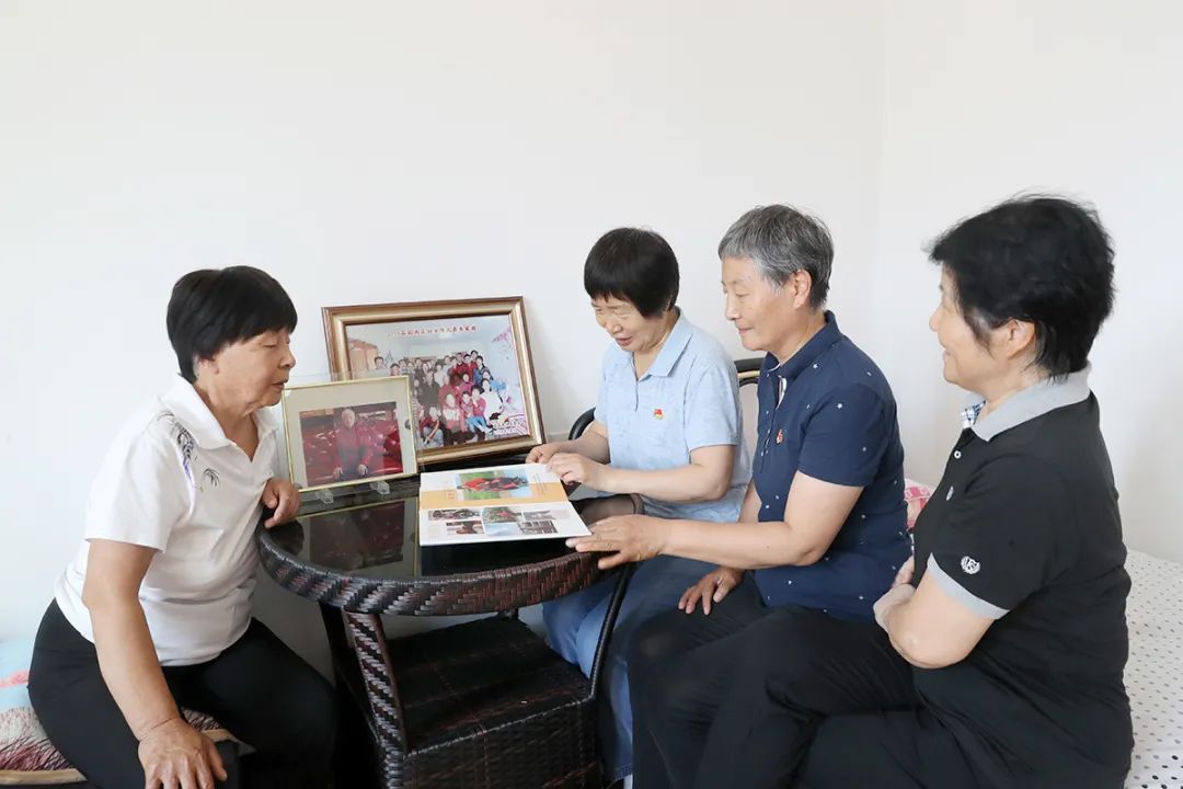 张明翠(右二)与姐妹翻阅父亲生前照片。