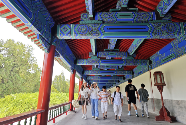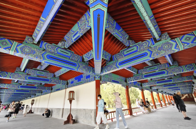 7月6日,天坛公园长廊区域历时一年完成修缮,恢复对公众开放。通过相关史料收集和研究,长廊恢复了吻合历史纹饰的雅伍墨旋子彩画,向游客展示其符合官式彩画原真性的古建彩画纹饰,再现了历史上的“七十二连房”。