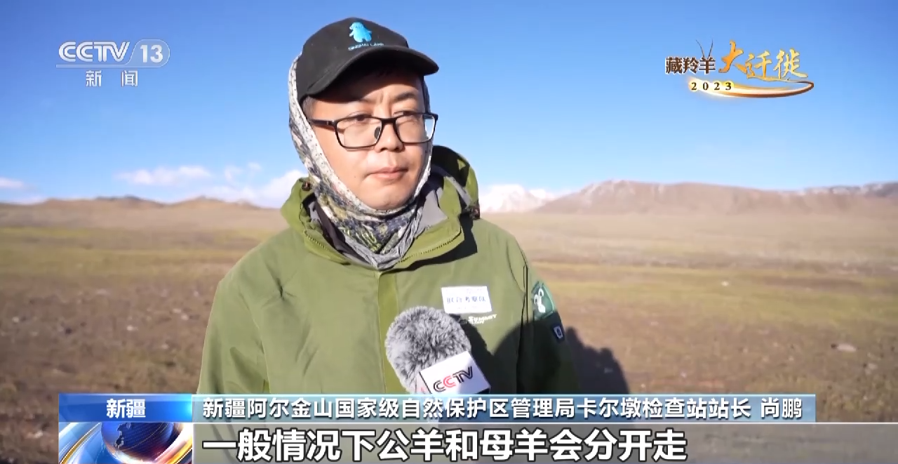 新疆阿尔金山国家级自然保护区管理局卡尔墩检查站站长 尚鹏:母羊渐渐开始往兔子湖、木孜塔格峰这块进行迁徙,其中也包括一些去年生产出生的公羊,有些还没有离开母亲,有时候会在怀孕的母羊群里发现一个角不是特别长的年幼的公羊跟着母亲在一块生长,一块迁徙,这种情况比较少,一般情况下公羊和母羊分开走。母羊也很辛苦,喜欢集群,团结起来对危险抵抗能力更强一些。