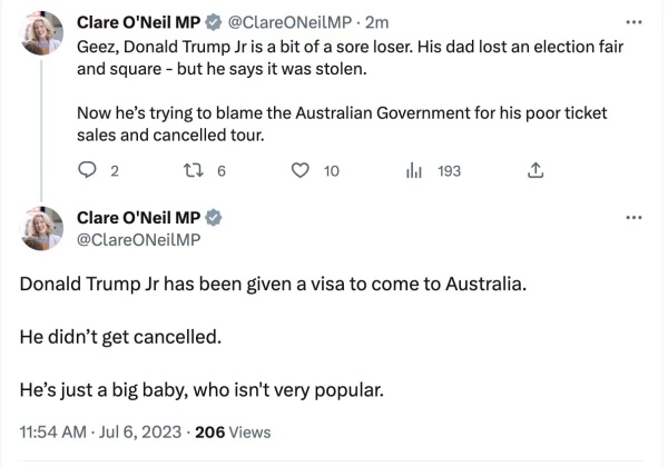 在目前已被删除的推文中,克莱尔·奥尼尔指责小特朗普“正试图把他糟糕的门票销量和取消行程的责任归咎于澳大利亚政府”,并讽刺他是“巨婴”。