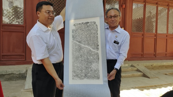 △通州博物馆向玉城丹尼赠送琉球人王大业墓碑拓片,通州博物馆供图。