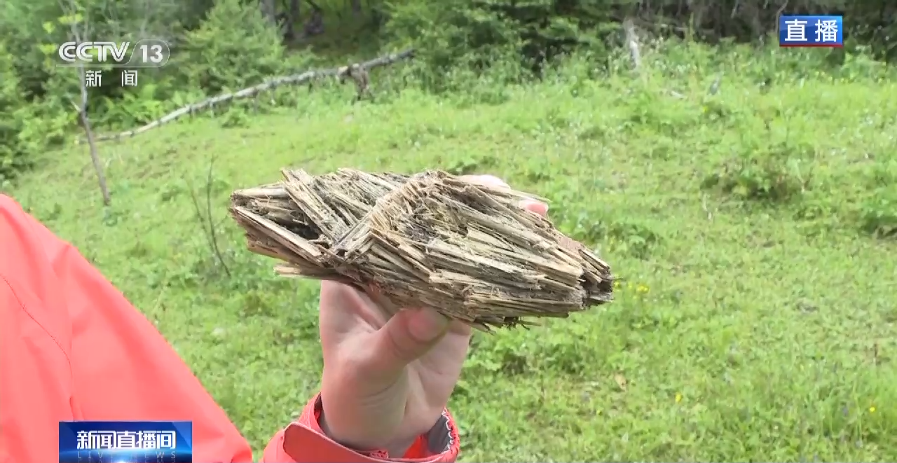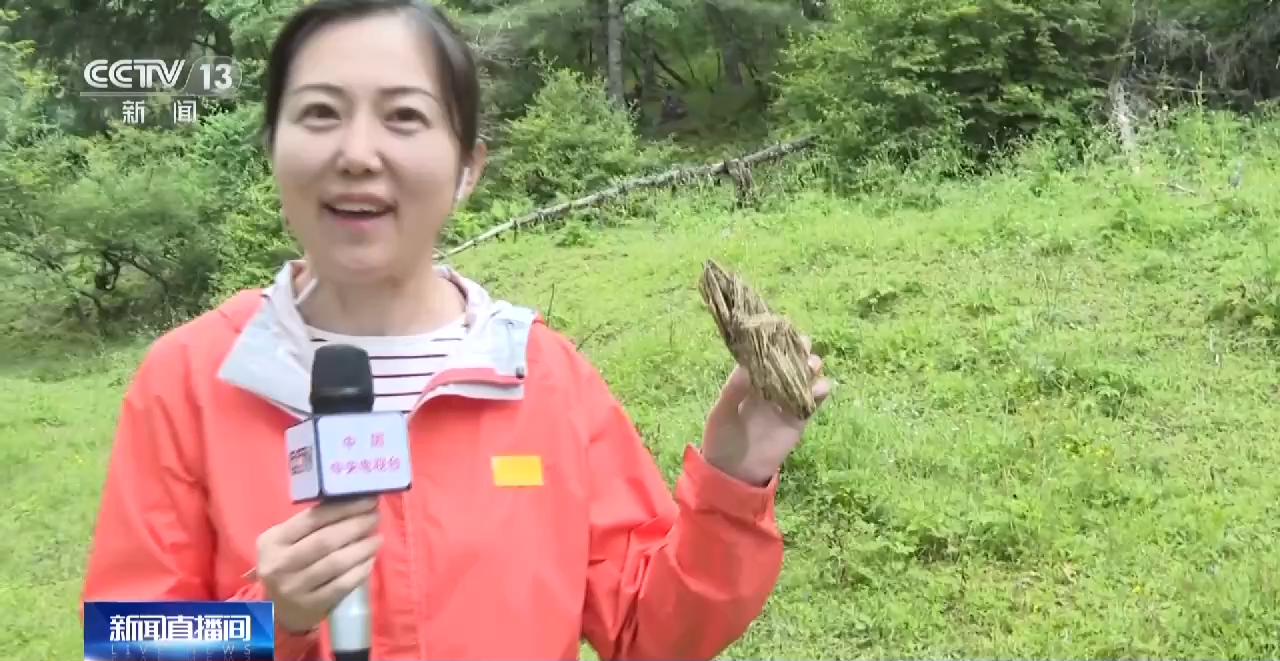 总台记者 焦健:园区里这些野生大熊猫的数量是怎么调查出来的?大家可以看看我手上的这块大熊猫粪便,它是这里的巡护人员昨天在巡山的时候发现的。我们知道,野生大熊猫是以竹子为主要的食物来源。而为了不被竹子划伤肠胃,大熊猫的肠道会分泌黏液,把吃进去的竹子包裹起来。因此真正被肠道消化吸收的竹子只有大约14%,剩余的86%都会被排出体外。所以大熊猫的粪便,其实并不臭,更多的是竹子的气味儿。