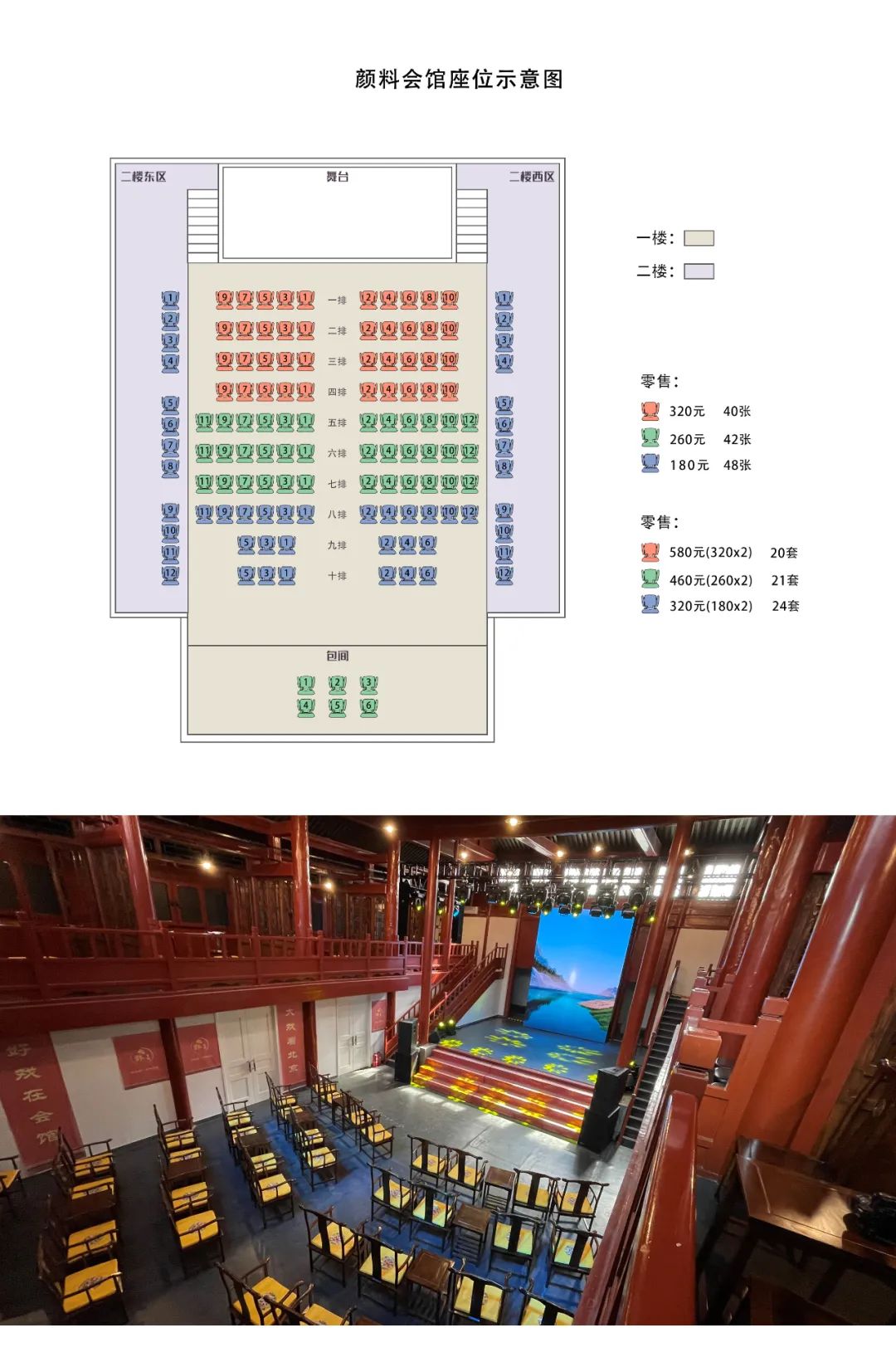 颜料会馆位于前门三里河畔青云胡同22号,占地面积约838平方米,建筑面积约713平方米。古朴的胡同中,这座会馆矗立此处已过400年了,早年间它由山西省颜料、桐油商人出资筹建,因而得名颜料会馆,2009年由天街集团修缮完毕。2021年获评为“北京市十大网红打卡地”,2023年4月荣获东城区首批演艺新空间认定。400年的老戏楼跨越时光,焕发时代活力。