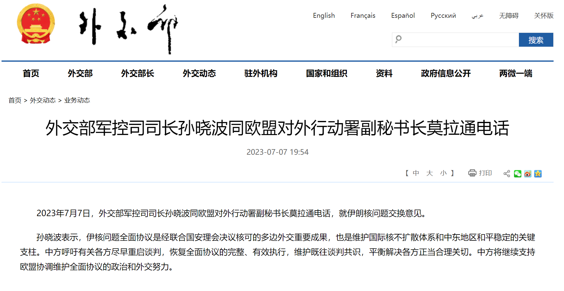 2023年7月7日,外交部军控司司长孙晓波同欧盟对外行动署副秘书长莫拉通电话,就伊朗核问题交换意见。