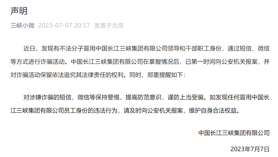 中国长江三峡集团有限公司发布声明表示,近日,发现有不法分子冒用中国长江三峡集团有限公司领导和干部职工身份,通过短信、微信等方式进行诈骗活动。中国长江三峡集团有限公司在掌握情况后,已第一时间向公安机关报案,并对诈骗活动保留依法追究其法律责任的权利。同时,郑重提醒如下: