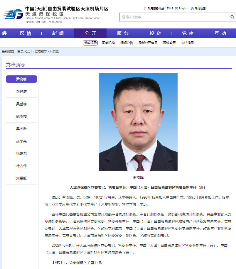 据天津港保税区官网“党政领导”信息显示,尹晓峰已任天津港保税区党委书记、管委会主任,中国(天津)自由贸易试验区管委会副主任(兼)、中国(天津)自由贸易试验区天津机场片区管理局局长(兼)。