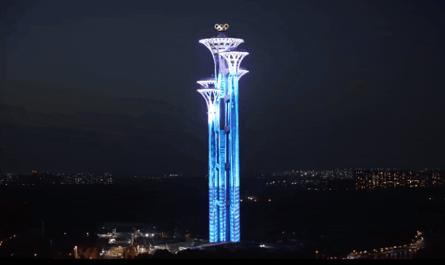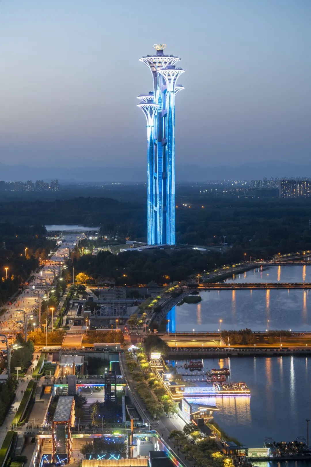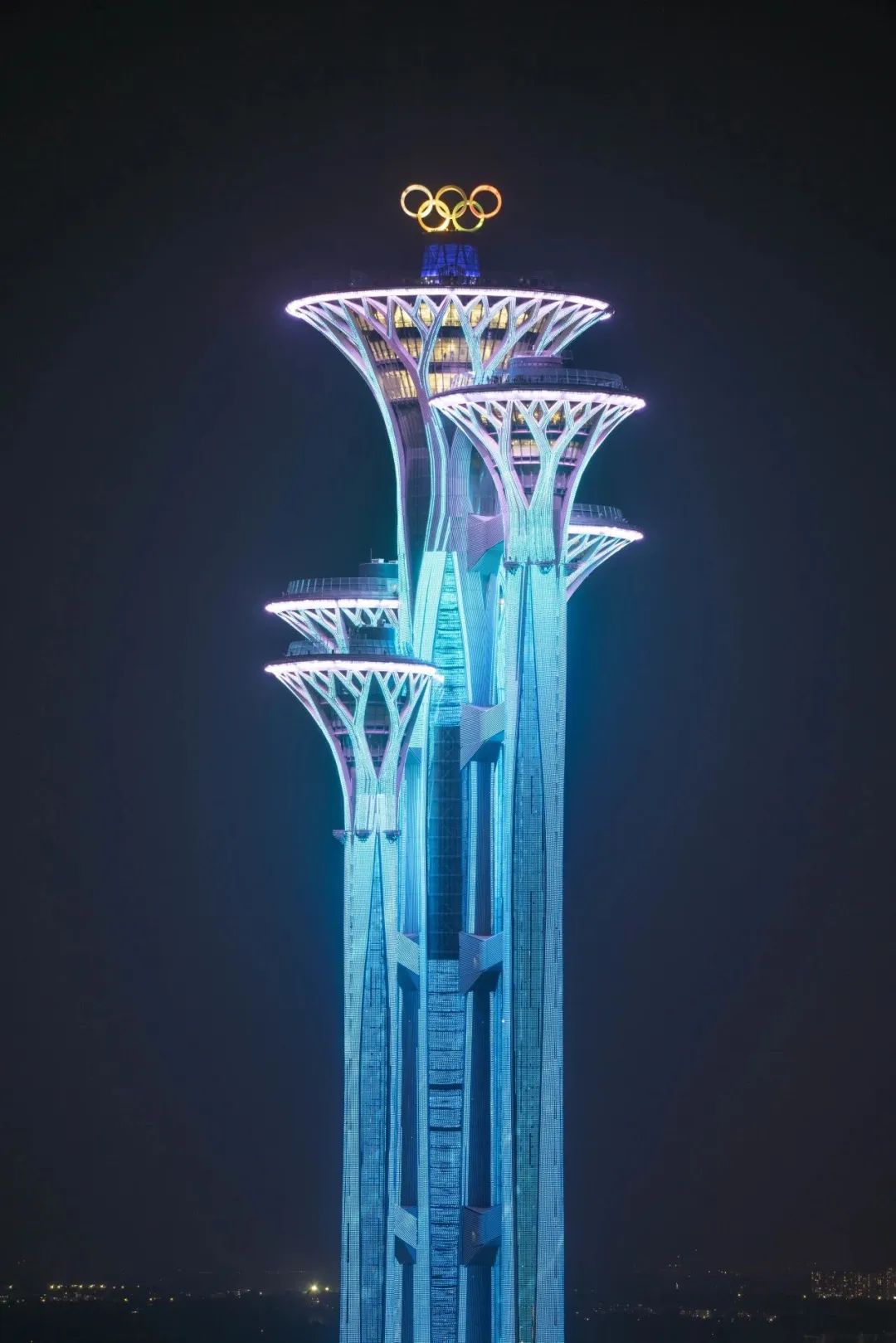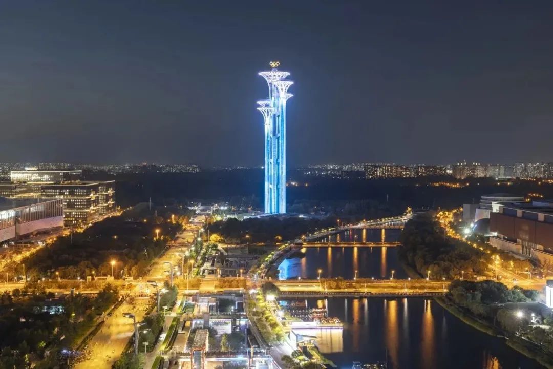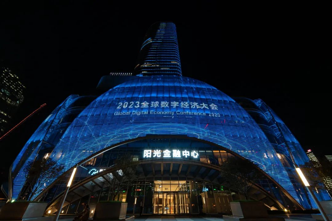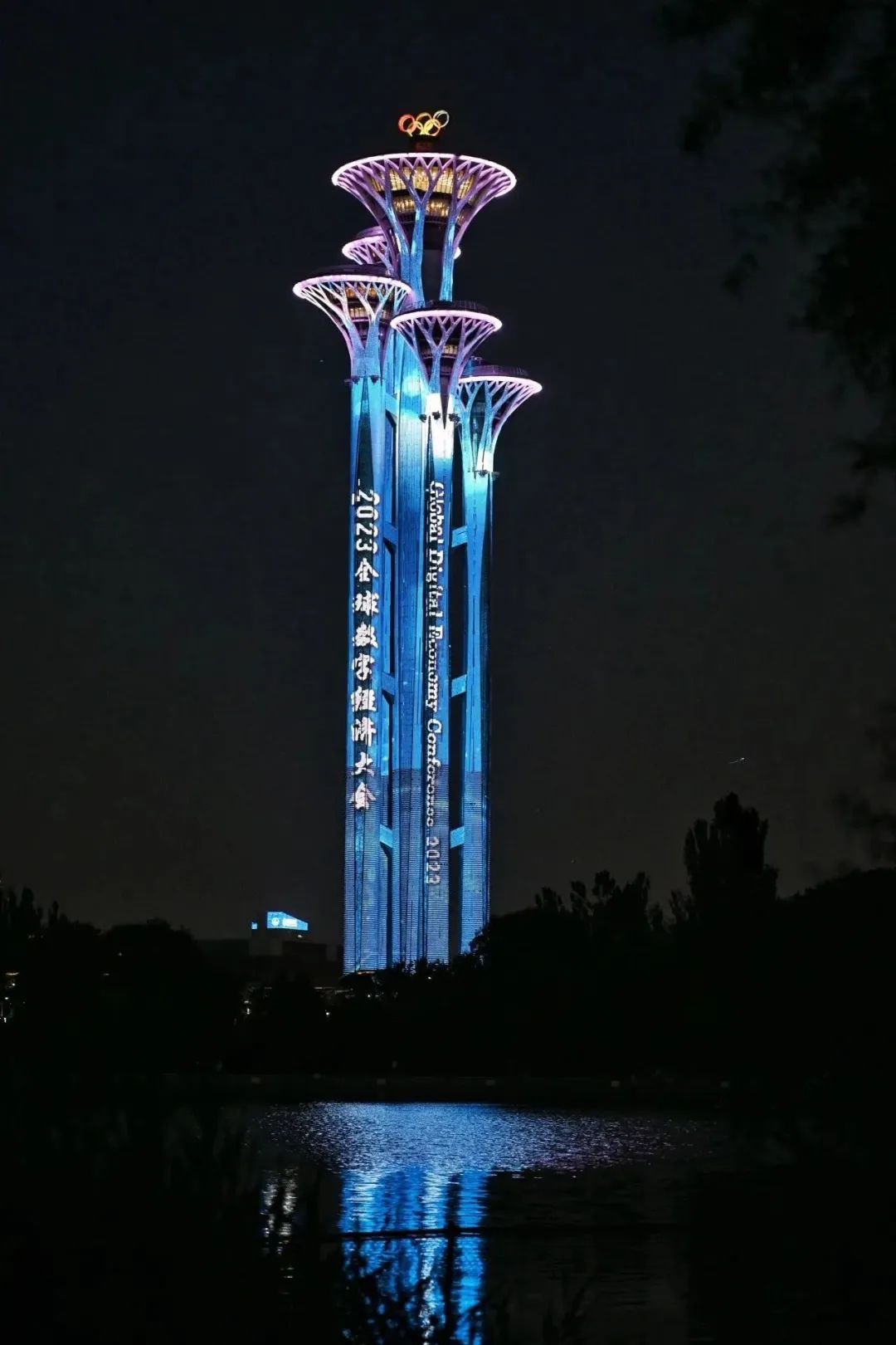 夜幕降临,奥林匹克塔上,色彩斑斓的“2023全球数字经济大会”等字样依次呈现。在2023全球数字经济大会期间,奥林匹克塔通过AR技术,沿着“构建中心、点亮通道、链接数字、畅想未来”四个展示步骤,描绘数字世界的未来,不断展示着数字经济大会的醒目标志,营造具有科技感的大会氛围,蓝色的基调配上流线的光芒,体现着数字科技的魅力,数字化的图案彰显着人们对未来和对科技的探索永不止步。