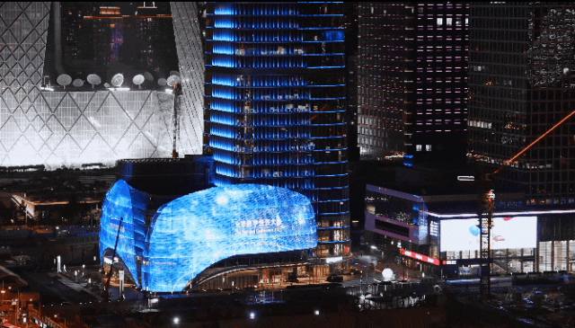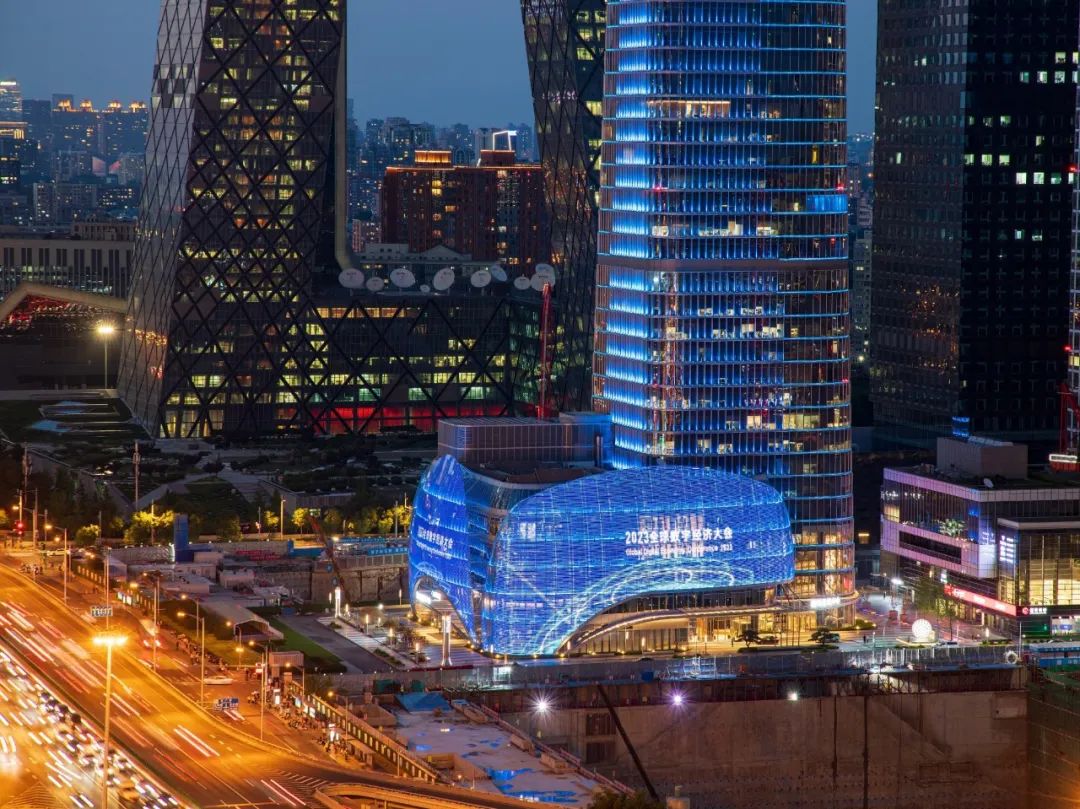 璀璨灯光还点亮了大望京建筑组群,“数字科技大会”等字样出现在建筑组群上,利用三维立体成像、全彩激光等科技手段展现的灯光秀,呈现出本次数字经济大会主题,为市民带来一场场视觉盛宴。