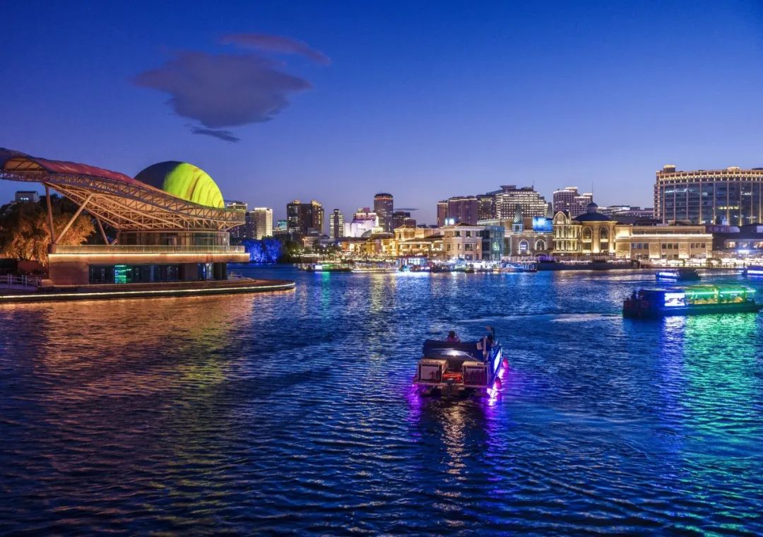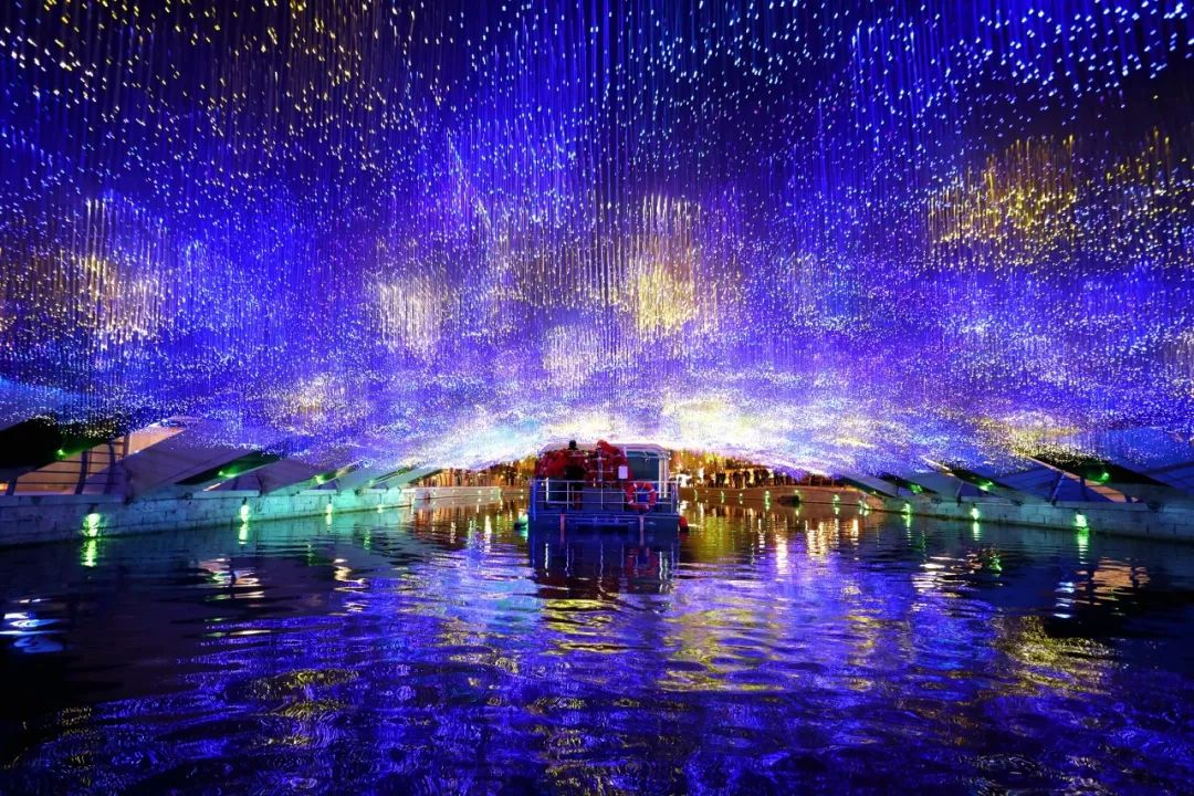 当暮色驱散暑气,亮马河两岸建筑被灯光点亮,乘观光船穿行水上,清风、水声、灯影、蛙鸣,此起彼伏。