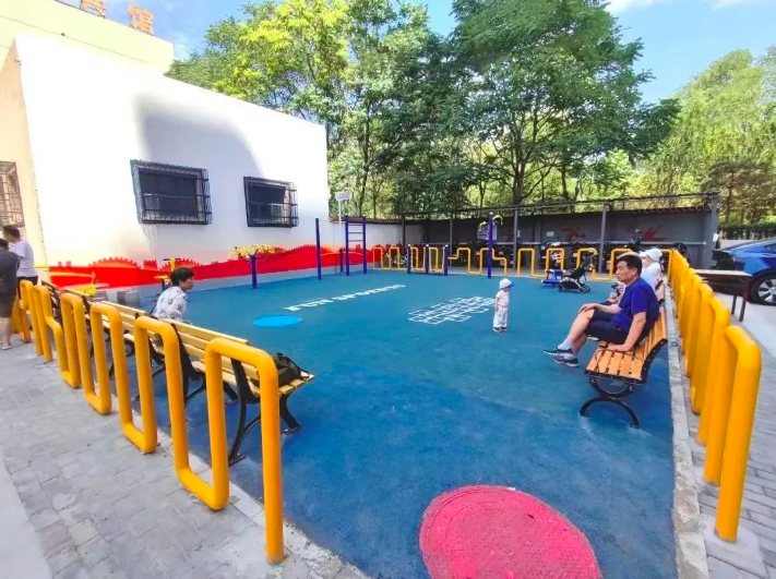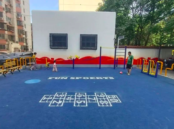 社区45号楼附近,原有的周边围墙被拆除,健身广场也重新进行了地面硬化,并铺设了适合老人儿童活动的室外彩色塑胶跑道专用材料。