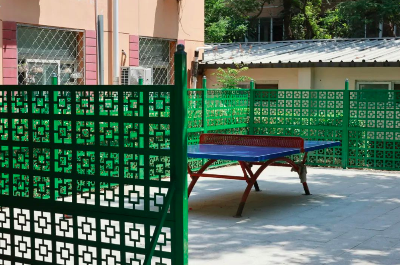 另一处在36号楼南侧的花园式健身广场,包含约100平方米的花岗岩防滑健步走路面,以及约90平方米的半封闭式乒乓球活动区。