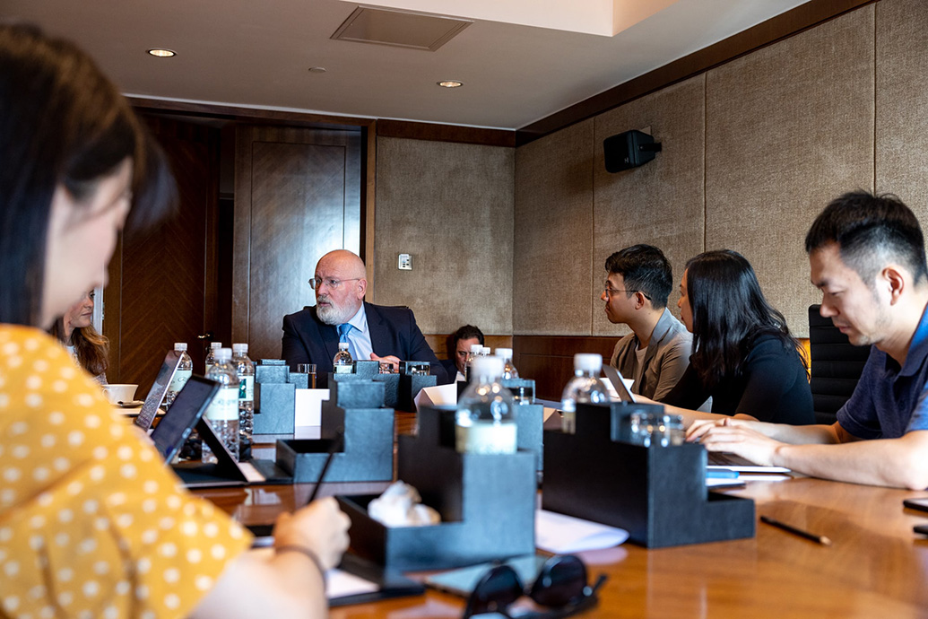 7月4日,就在高层对话结束后几个小时后,在同一间房间内,蒂默曼斯接受了一个小范围的媒体采访,他表示,这次访华与中国官员们的对话卓有成效,他希望中欧继续深入开展绿色产业、气候变化等领域的务实合作,共同寻找人类更好生存的解决方案。