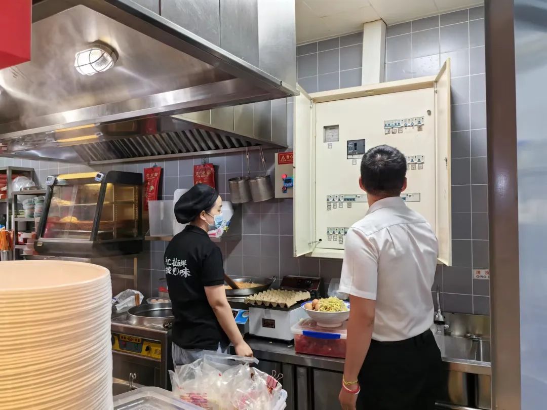 检查组检查超市门店内餐饮企业用电情况。