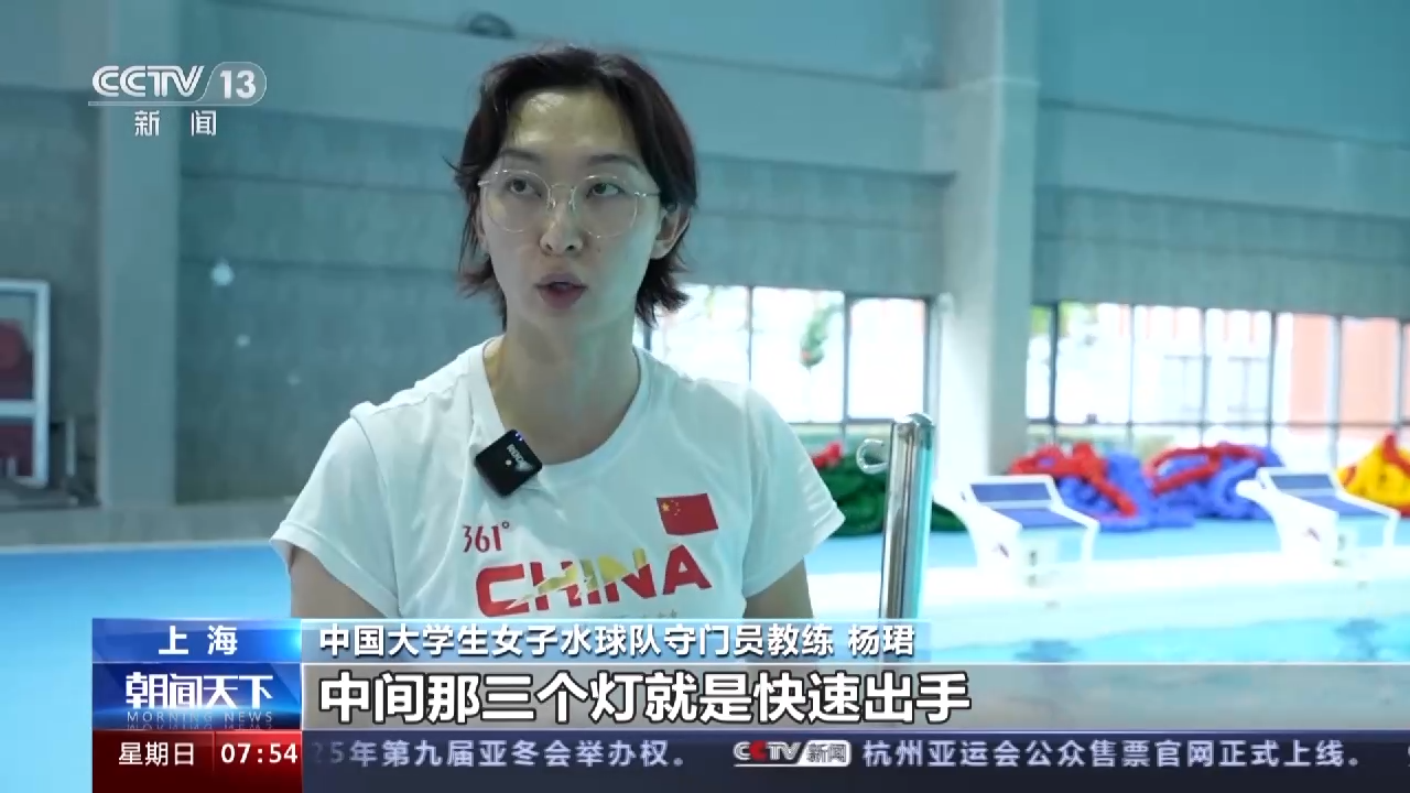 中国大学生女子水球队守门员教练 杨珺:跳两边角和防吊球的,中间那三个灯就是快速出手,还有支撑的训练。每周都起码要练两次,尤其是大赛之前,然后对她这个速度要求比较高一点。