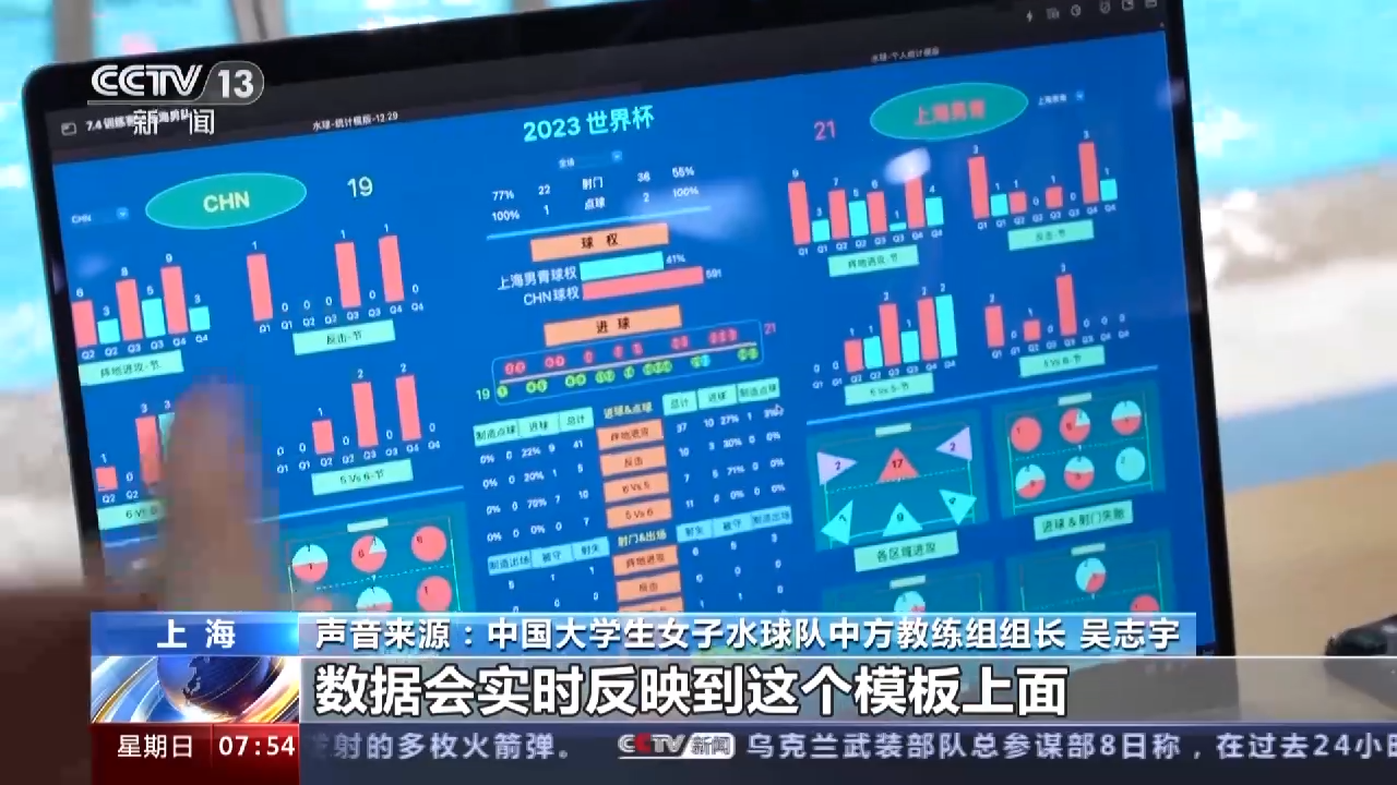 中国大学生女子水球队中方教练组组长 吴志宇:它这里是一个数据统计的一个模板,然后统计完了以后,数据会实时反映到这个模板上面。可以通过这个视频看防守哪里出了问题,哪里失了位置。