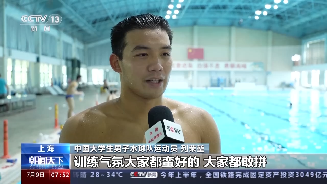 中国大学生男子水球队运动员 列荣堃:训练气氛大家都蛮好的,大家都敢拼。比如说游泳的话,大家就一起冲起来,就我不能让你快过我这样子。