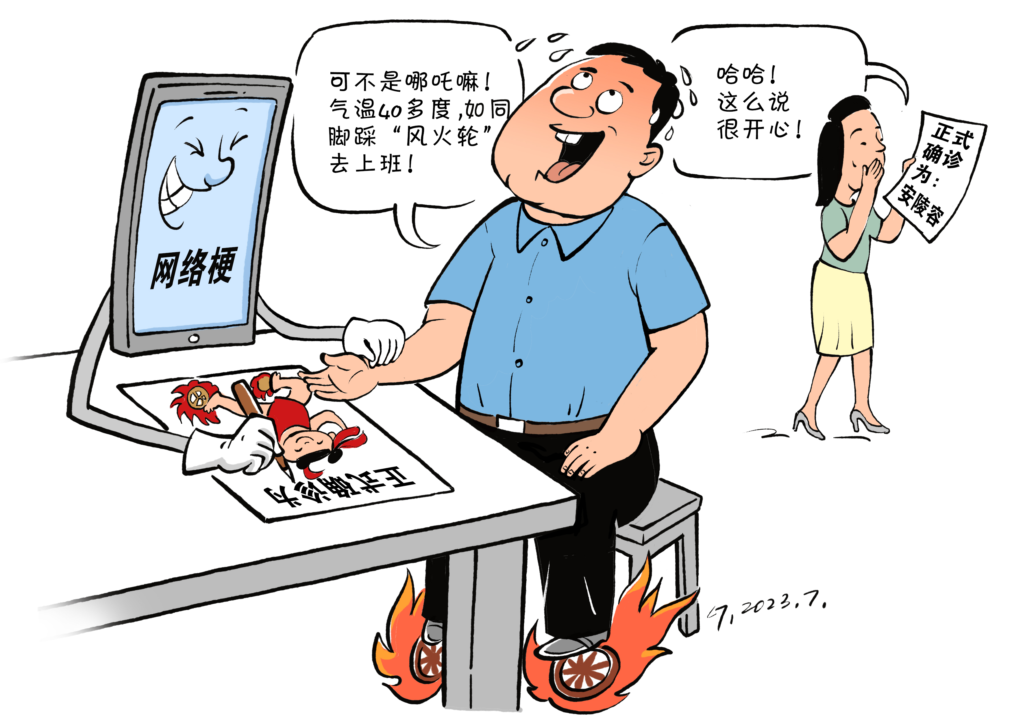 近日,“被正式确诊为××”成为网络流行梗。由于持续高温,“北京人被正式确诊为哪吒”,意思是像哪吒一样脚踏风火轮去上班;“福建人正式被确诊为孙悟空”,意思是当地人像孙悟空那样待在炼丹炉里;“到处都是游客只想窝在家里”,西安人“被正式确诊为沈眉庄”……有人觉得“确诊体”幽默风趣,也有人觉得反映出表达的贫瘠。对这样的流行梗,不妨多一点宽容。