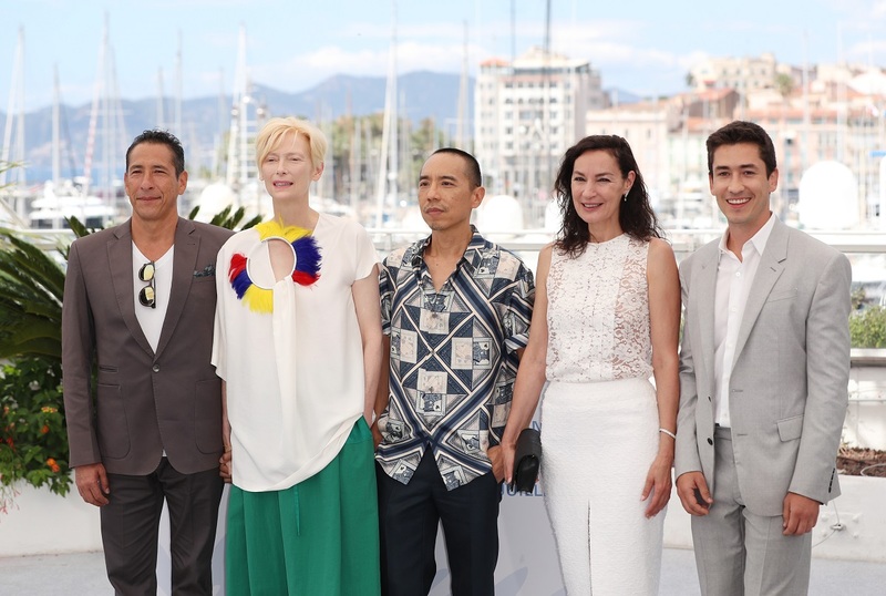 阿彼察邦与《记忆》演员蒂尔达·斯文顿等在戛纳电影节(图片来源 新华社)