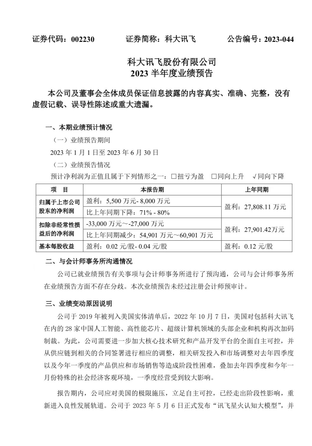 7月10日,科大讯飞发布2023半年度业绩预告,称上半年归属于上市公司股东的净利润预计为5500万元至8000万元,上年同期为盈利27808.11万元,同比下降71%至80%。