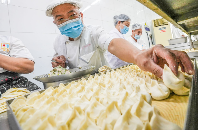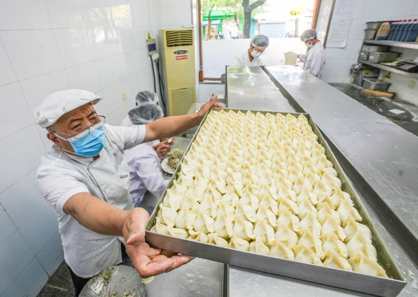 为了让市民都能在头伏这天吃上饺子,店里提前准备了800斤面粉,备货量比平日多三倍。头伏当天,后厨和面师傅凌晨4点半就得上岗,40多名员工全员上岗,几乎一刻不停才能满足头伏饺子的供应需求。