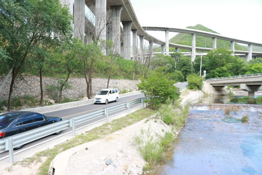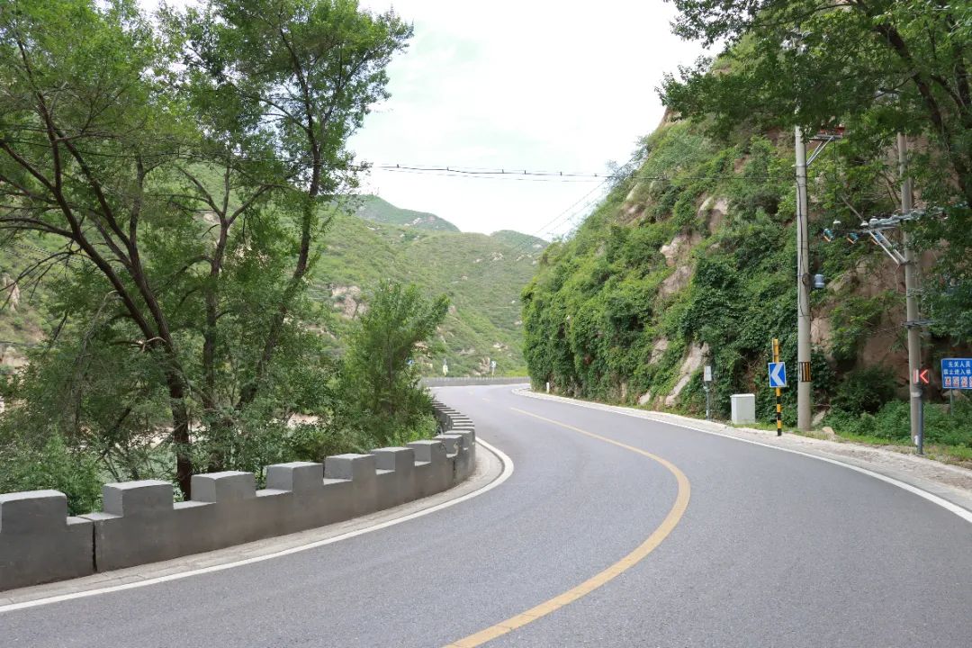 随着公路海拔攀升,车辆进入盘山路段,颇有蜿蜒曲折、峰回路转的意趣,公路一侧的山体高高耸立,宛如屏障,另一侧的佛峪口水库如玉似翠,唯美静谧。