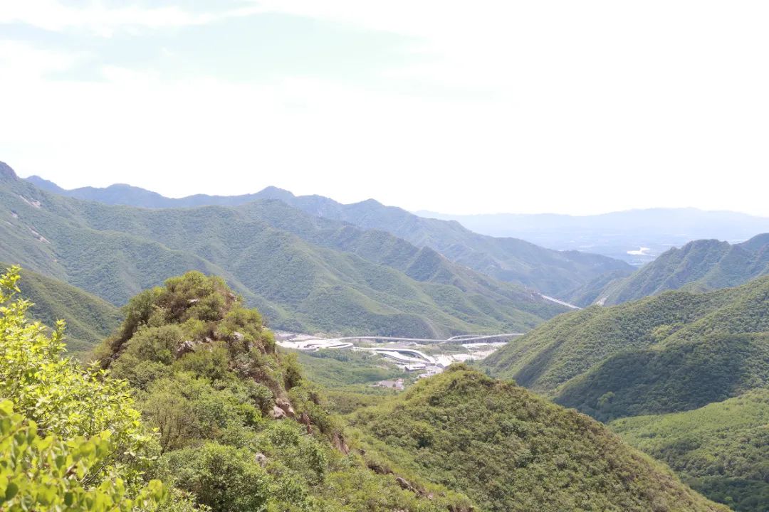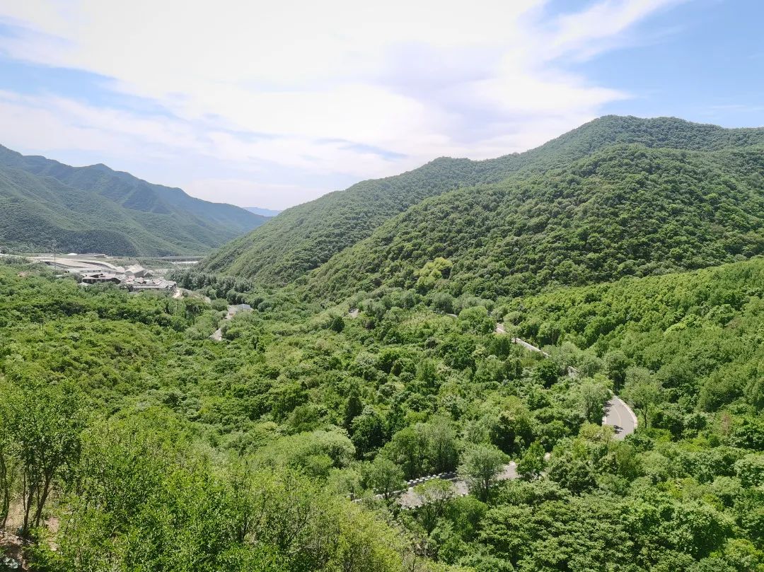 继续向前行进,风光变幻无穷,或林荫蔽日或溪水潺潺,或山谷清幽或群山莽莽,移步易景、美不胜收,令人心旷神怡。行驶到海拔较高处,但见青峰重叠、群山拥翠,松闫路蛇行斗折、百折千回与远处的高速公路、延庆奥林匹克园区,以及更远处的城镇村庄交织错落、相辅相成,仿佛画中景象。
